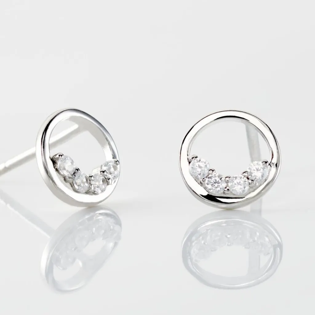 Boucles D’oreilles Puces Argent Blanc 925/1000 Cercles Sertis Griffes 3 Oxydes De Zirconium