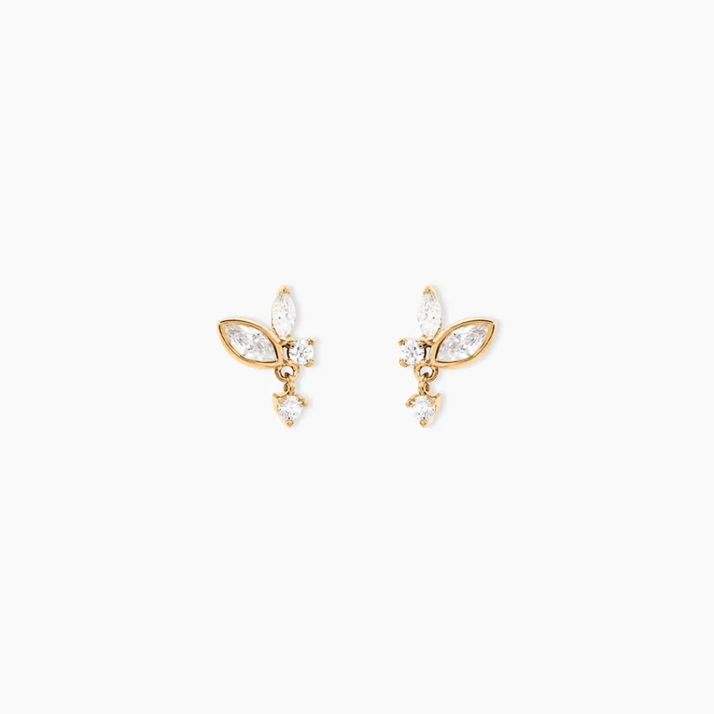 Boucles D’Oreilles Puces Plaqué Or Jaune Oxydes De Zirconium Blanc Serti Clos Tailles Navettes Et Poires