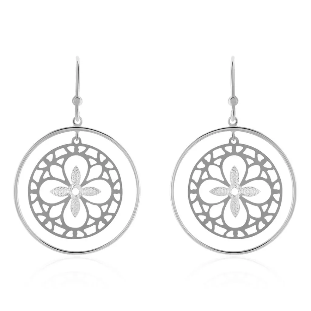 Boucles D’oreilles Pendantes Or Blanc 375/1000 Double Cercles Avec Motif Trefles Ajoures