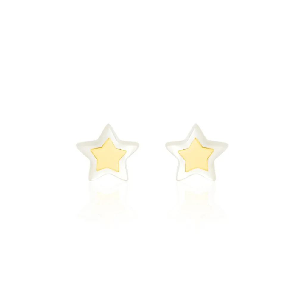 Boucles D’oreilles Or Jaune 375/1000 Puces Formes Etoiles + Motifs Etoiles Nacre Blanche