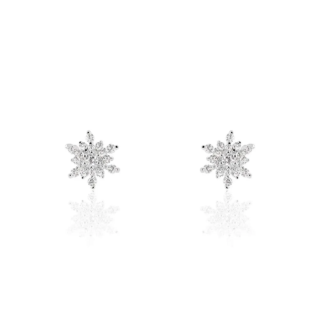 Boucles D’oreilles Puces Argent Blanc 925/1000 Motifs Flocons Oxydes De Zirconium