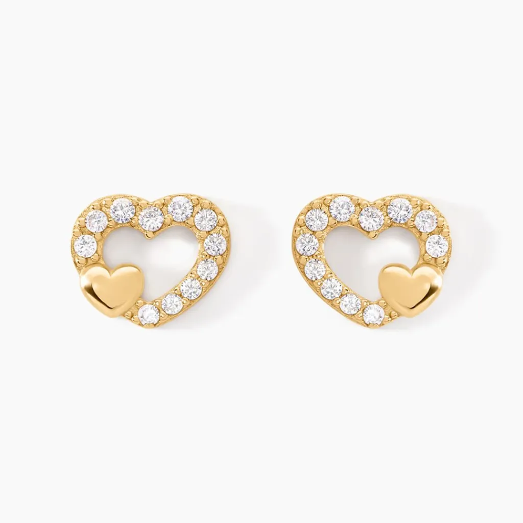 Boucles D’oreilles Or Jaune 375/1000 Puces Motifs C艙urs Paves Oxydes De Zirconium + Motif C艙ur Plein