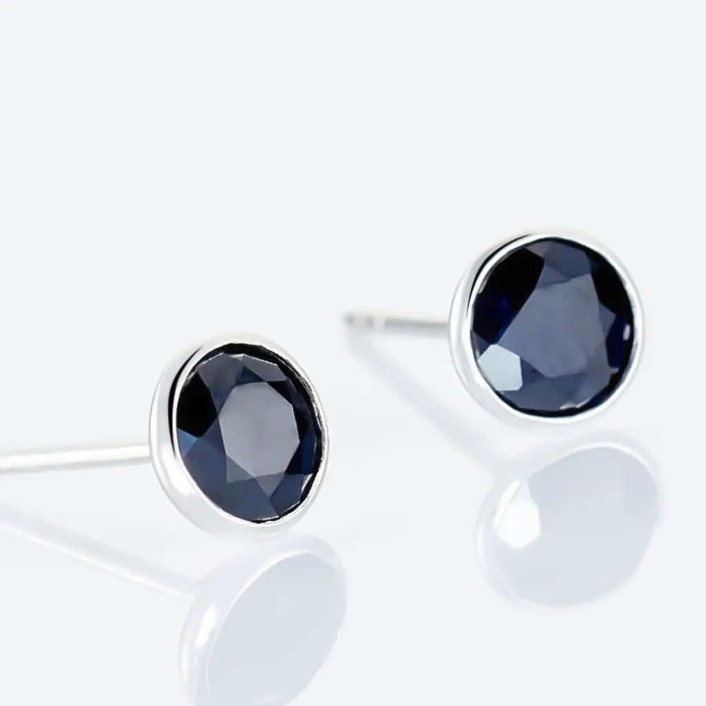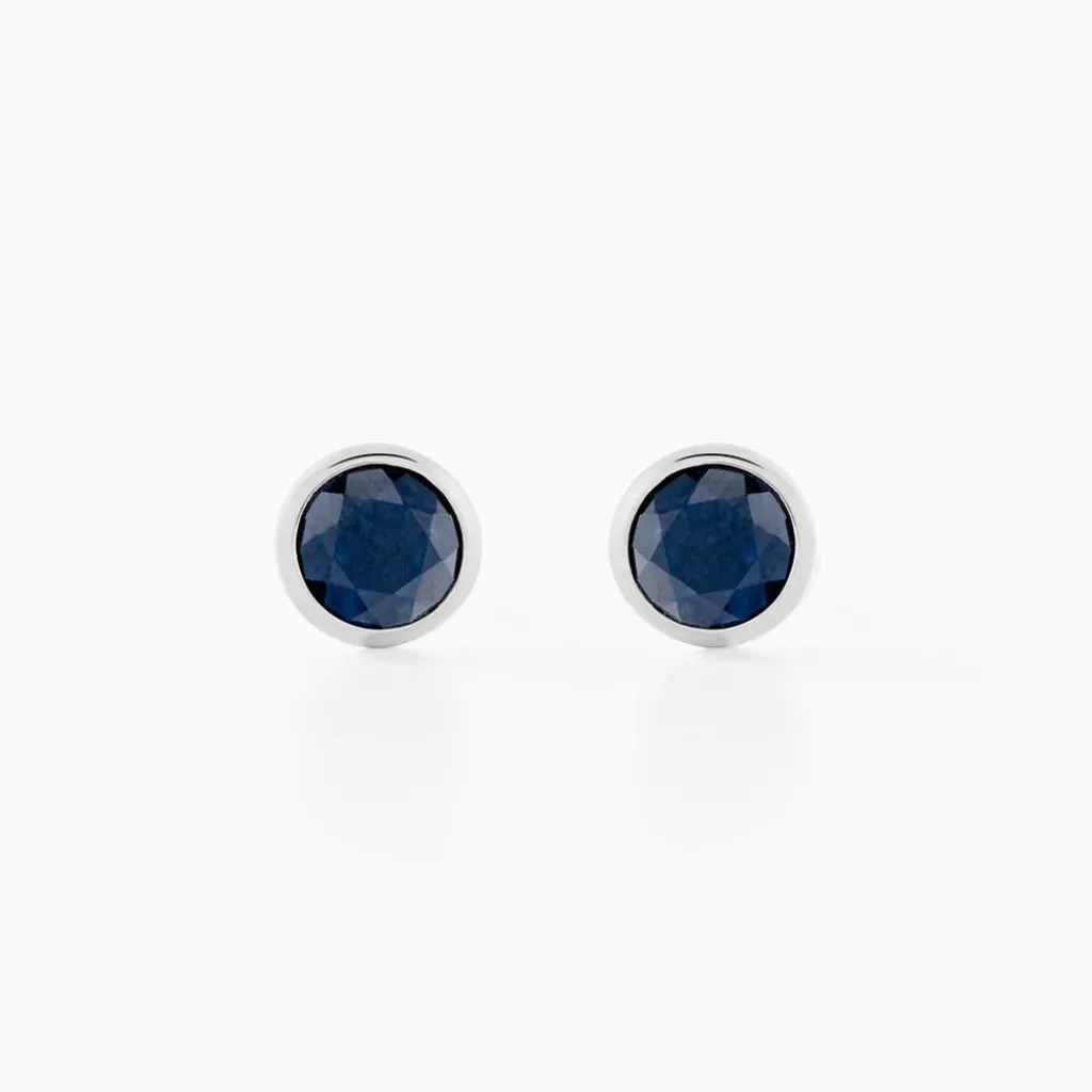 Boucles D’oreilles Or Blanc 375/1000 Puce Saphirs Ronds Noirs Sertis Clos 5mm Gm