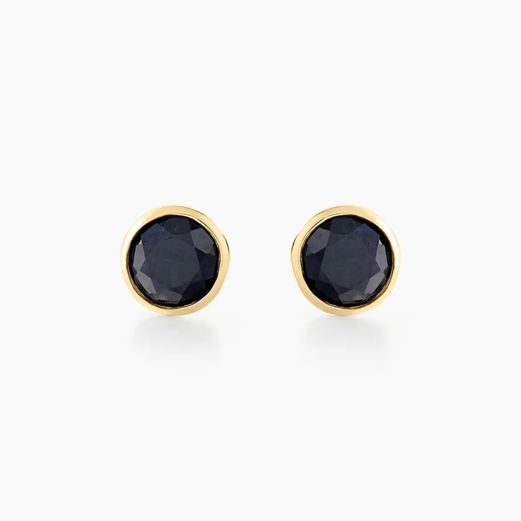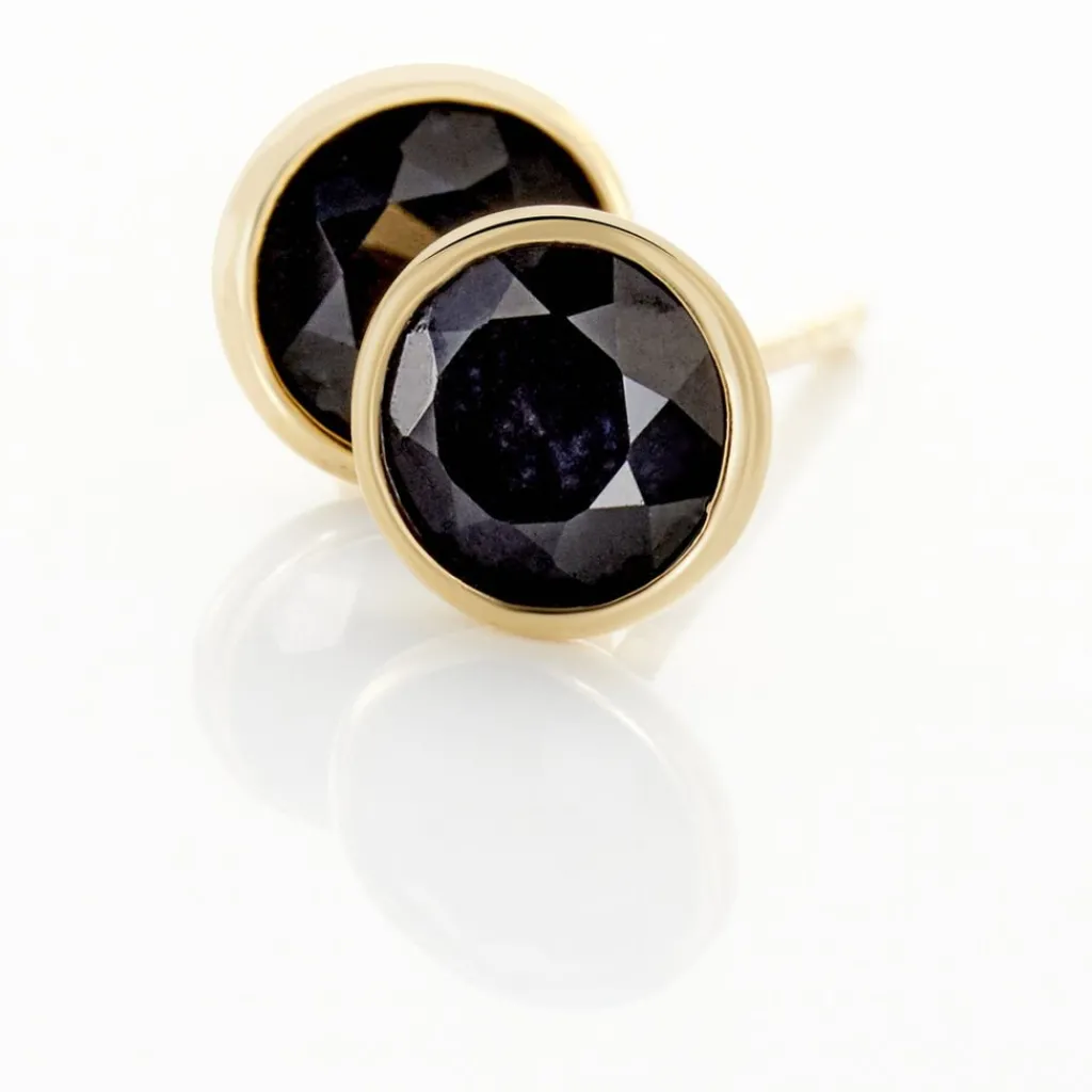Boucles D’oreilles Or Jaune 375/1000 Puce Saphir Noir Rond Serti Clos 5mm Gm