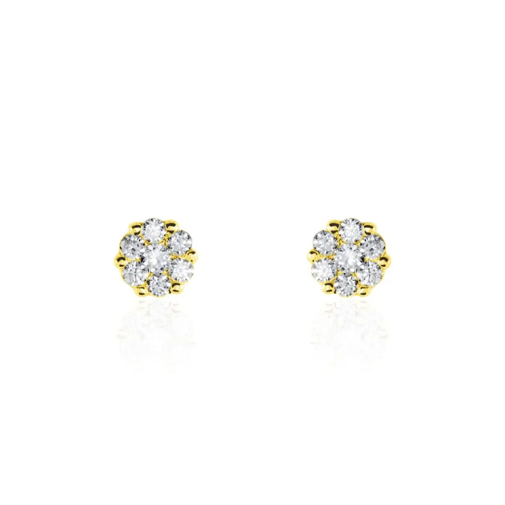 Boucles D’oreilles Or Jaune 375/1000 Fleur Avec Poussette Silicone Oxydes De Zirconium