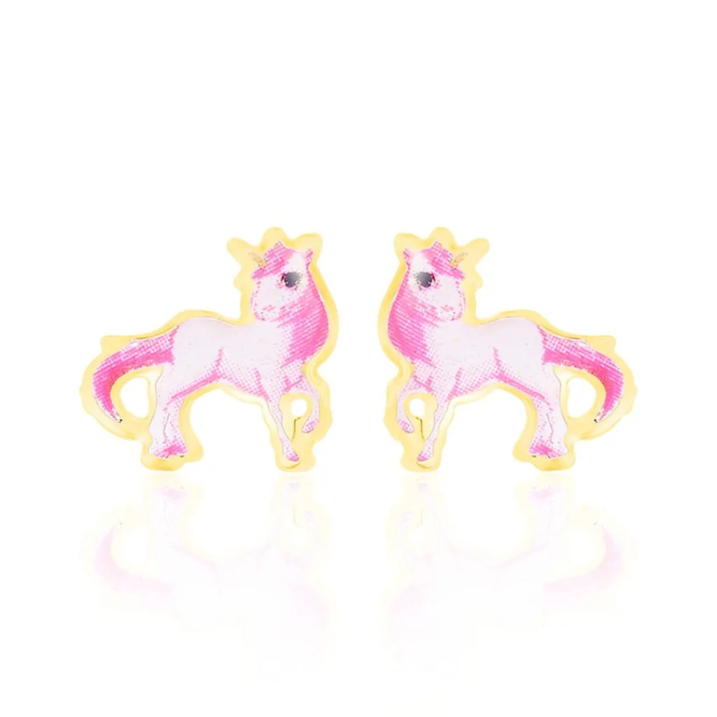 Boucles D’oreilles Or Jaune 375/1000 Puces Motifs Poneys Smalto Rose