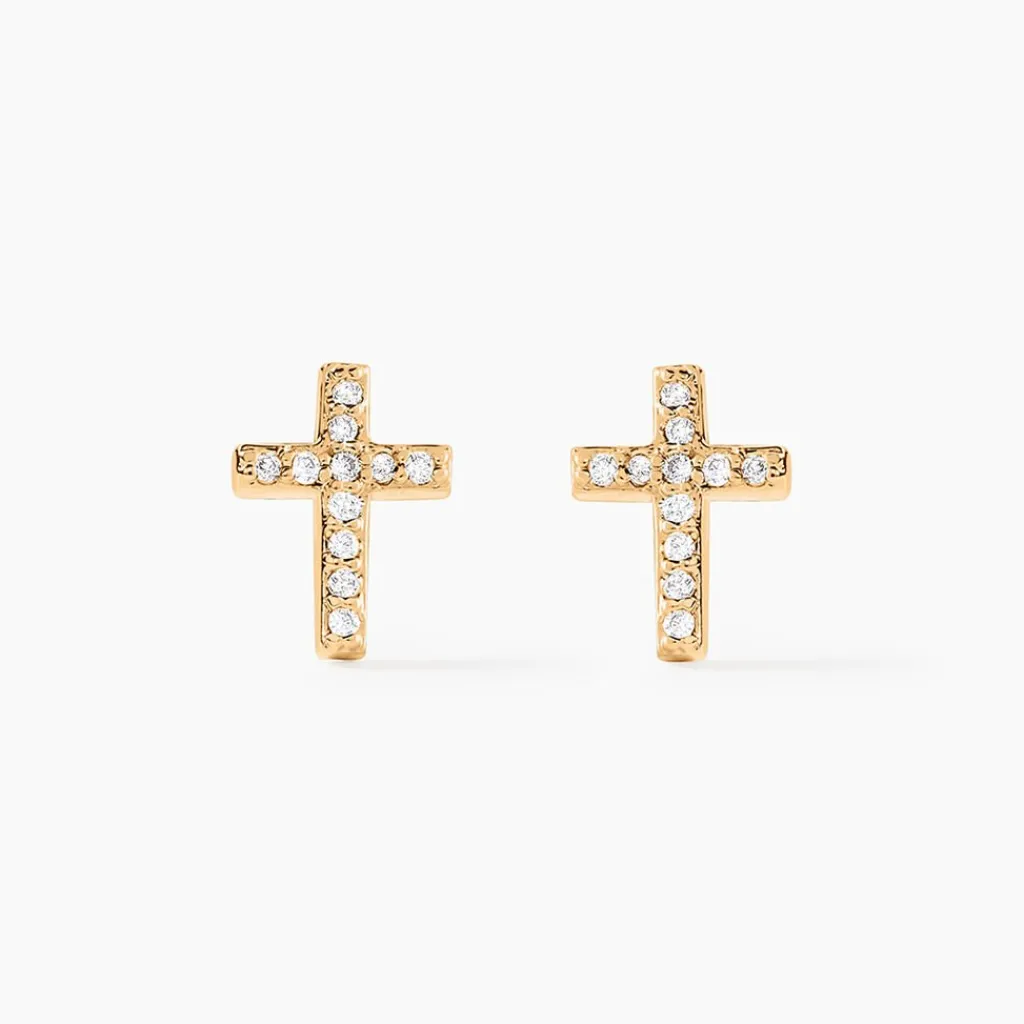 Boucles D’oreilles Puces Plaqué Or Jaune Croix Pavages Oxydes De Zirconium