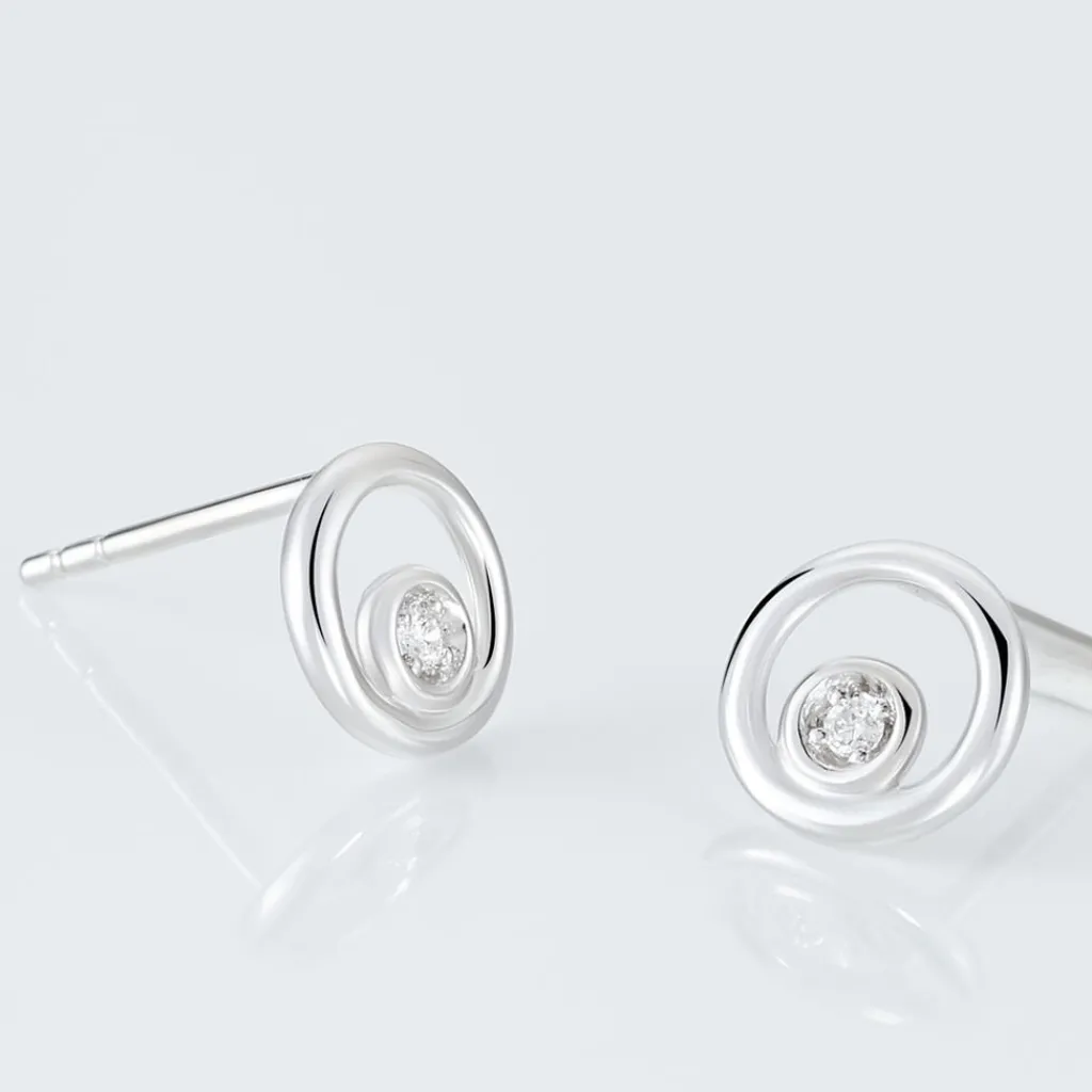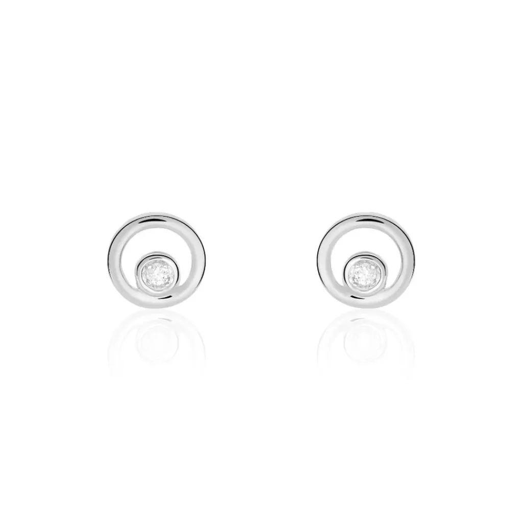 Boucles D’oreilles Or Blanc 375/1000 Puces Motifs Cercles Ajoures Diamant Centraux 0.037ct