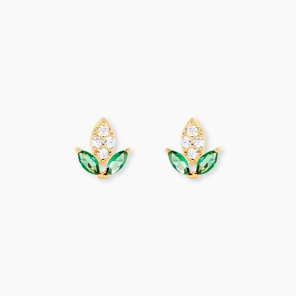 Bo Puces Or Jaune 375/1000 Fleur Oxyde De Zirconium Vert Serti 2 Griffes