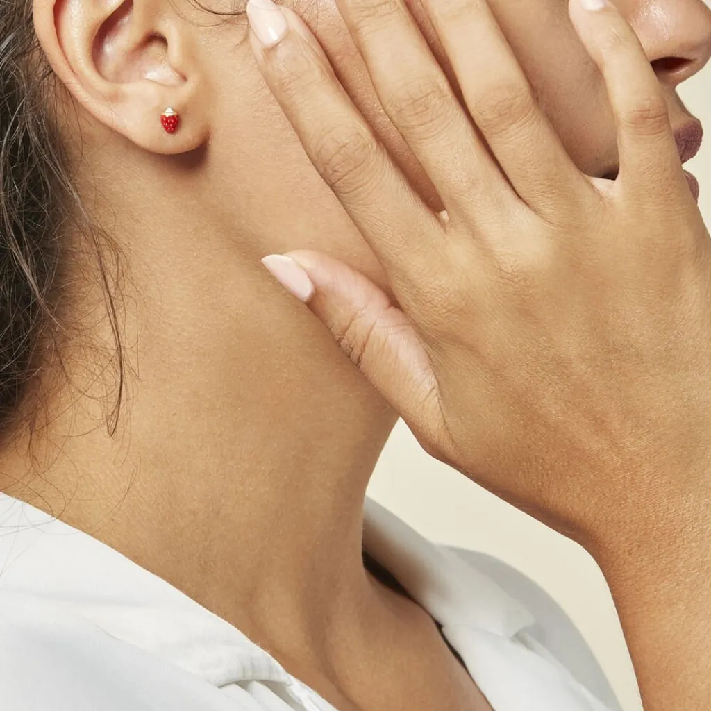 Boucles D’oreilles Or Jaune 375/1000 Fraise Email Rouge Et Verte