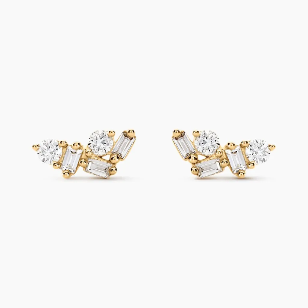 Boucles D’oreilles Puces Or Jaune 375/1000 Jardin De Pierres Diamants Synthetiques Rondes 0.12cts Et Baguettes Sertis Griffes