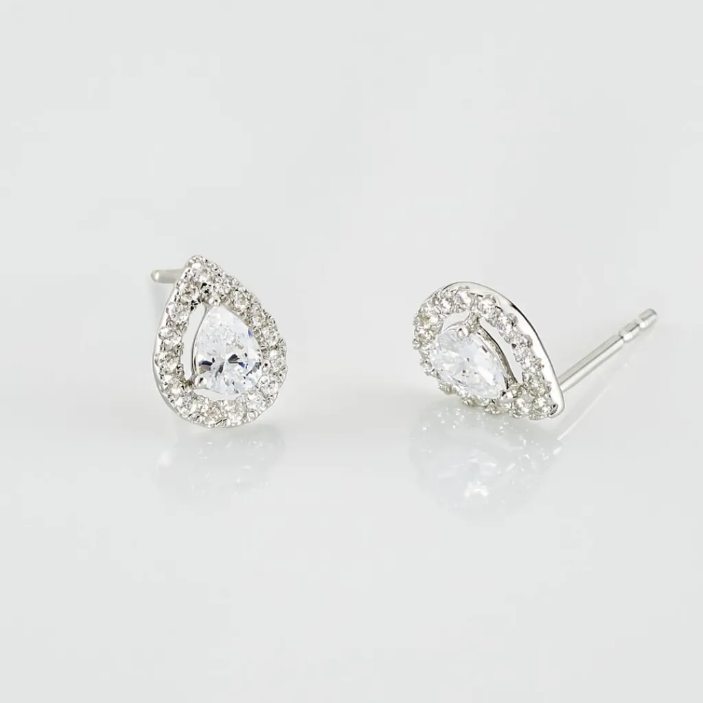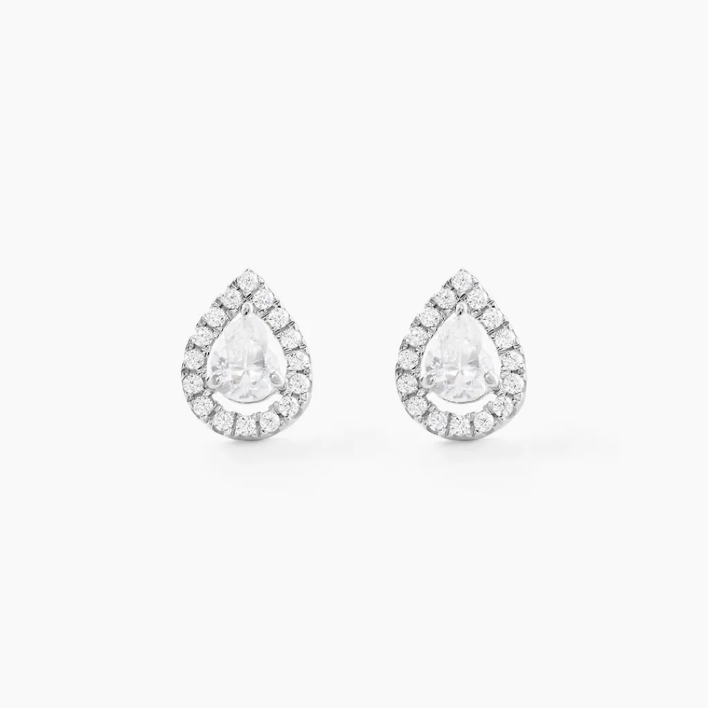 Boucles D’oreilles Or Blanc 375/1000 Puces Oxydes De Zirconium Centraux Formes Poires Entourage Oxydes De Zirconium