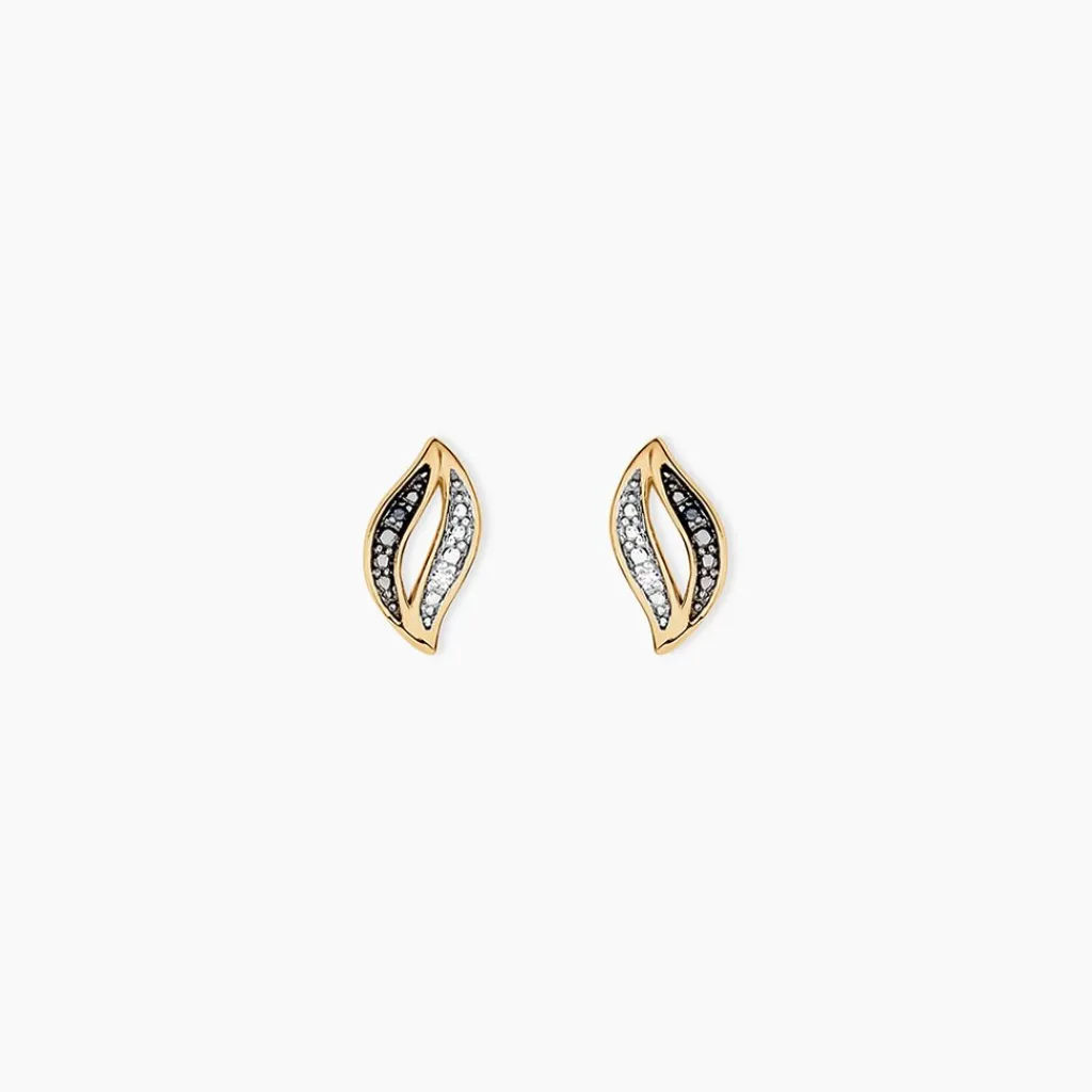 Boucles D’Oreilles Puces Or Jaune 375/1000 Vagues Pavage Diamant Noir Et Blanc