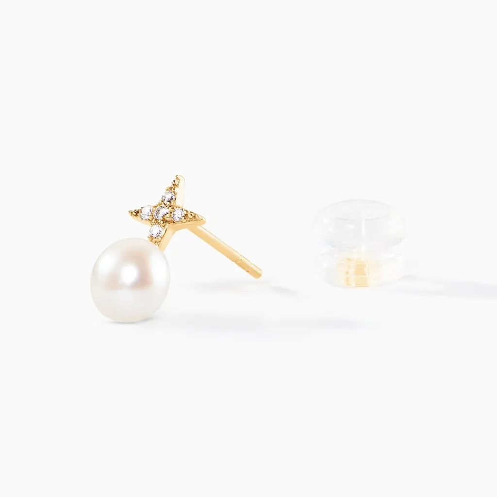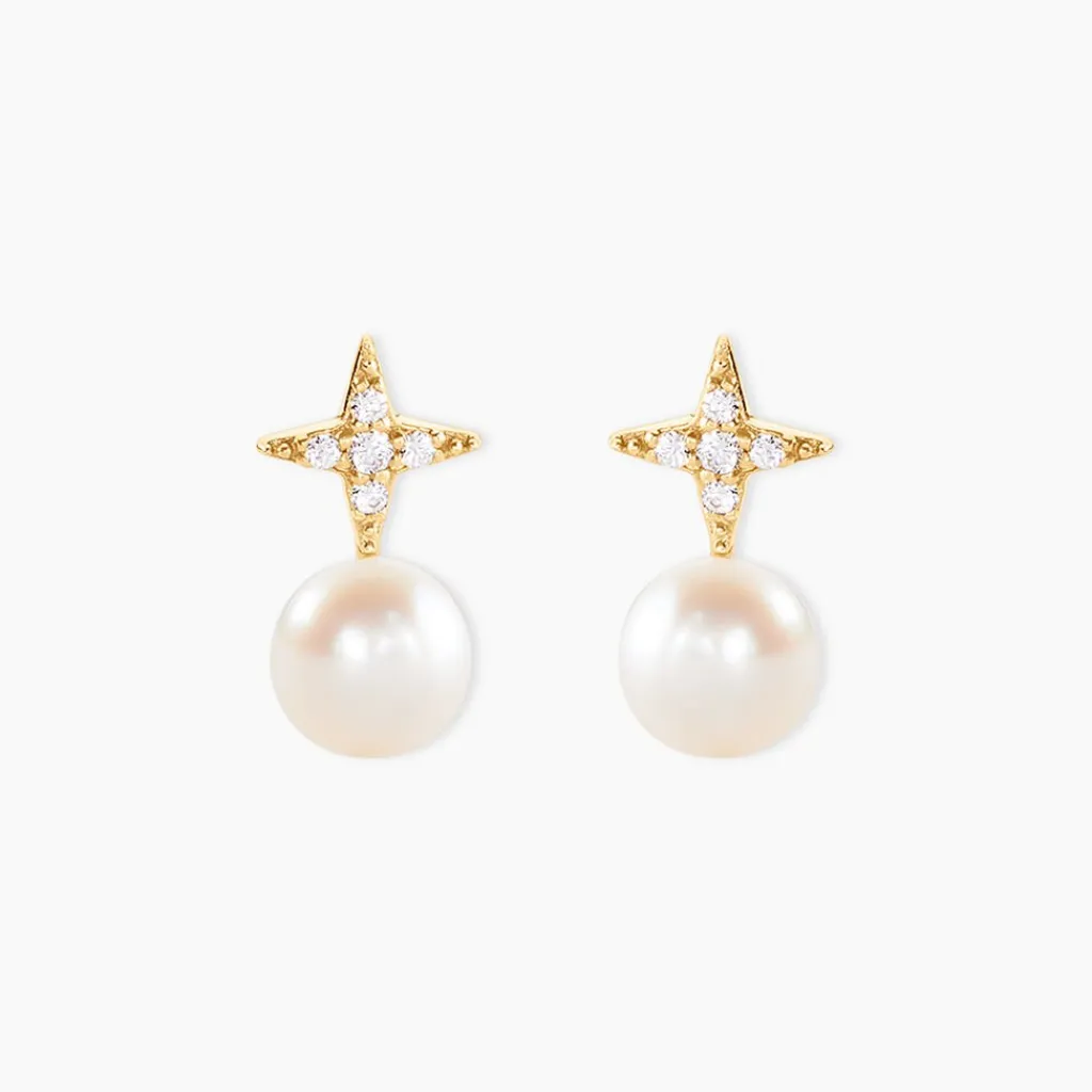 Boucles D’Oreilles Puces Or Jaune 375/1000 Perles De Culture Boutons 5Mm Accompagnees Etoiles Oxydes De Zirconium