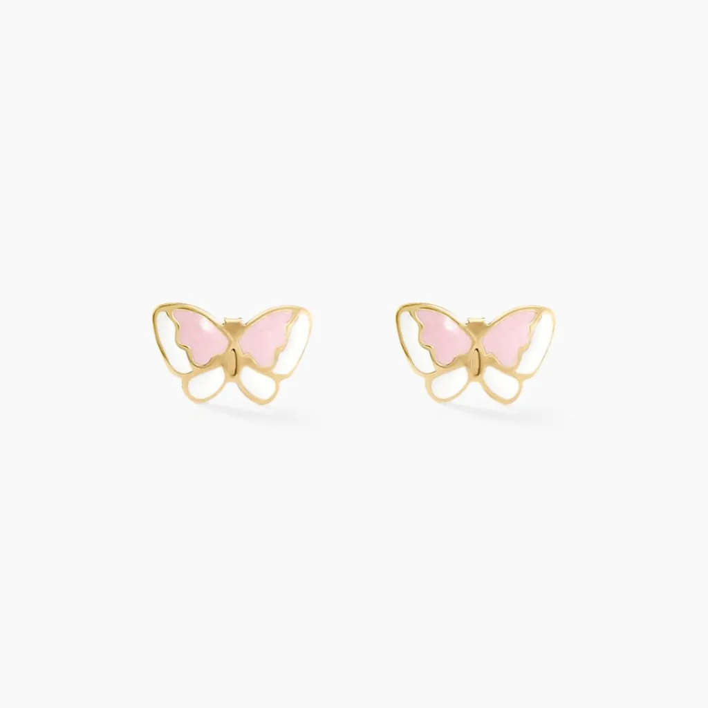 Boucles D’oreilles Puces Or Jaune 750/1000 Papillon Email Rose Fermoir A Vis