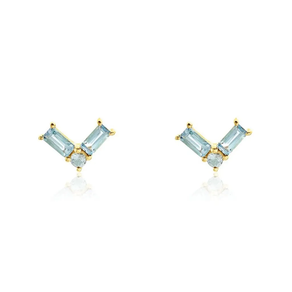 Boucles D’oreilles Puces Baguette Or Jaune 375/1000 Topaze Bleu Sky Serti 4 Griffes