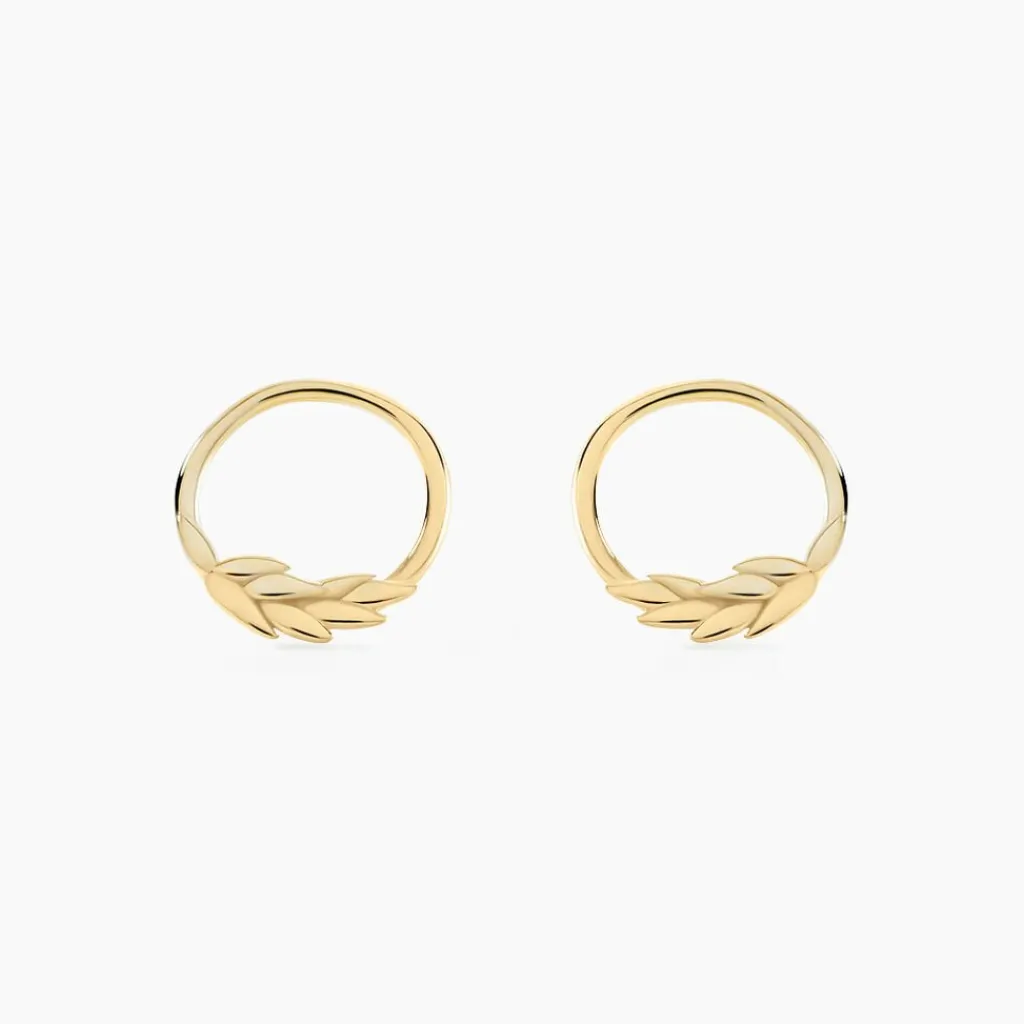 Boucles D’oreilles Puces Or Jaune 375/1000 Cercles Feuilles De Laurier