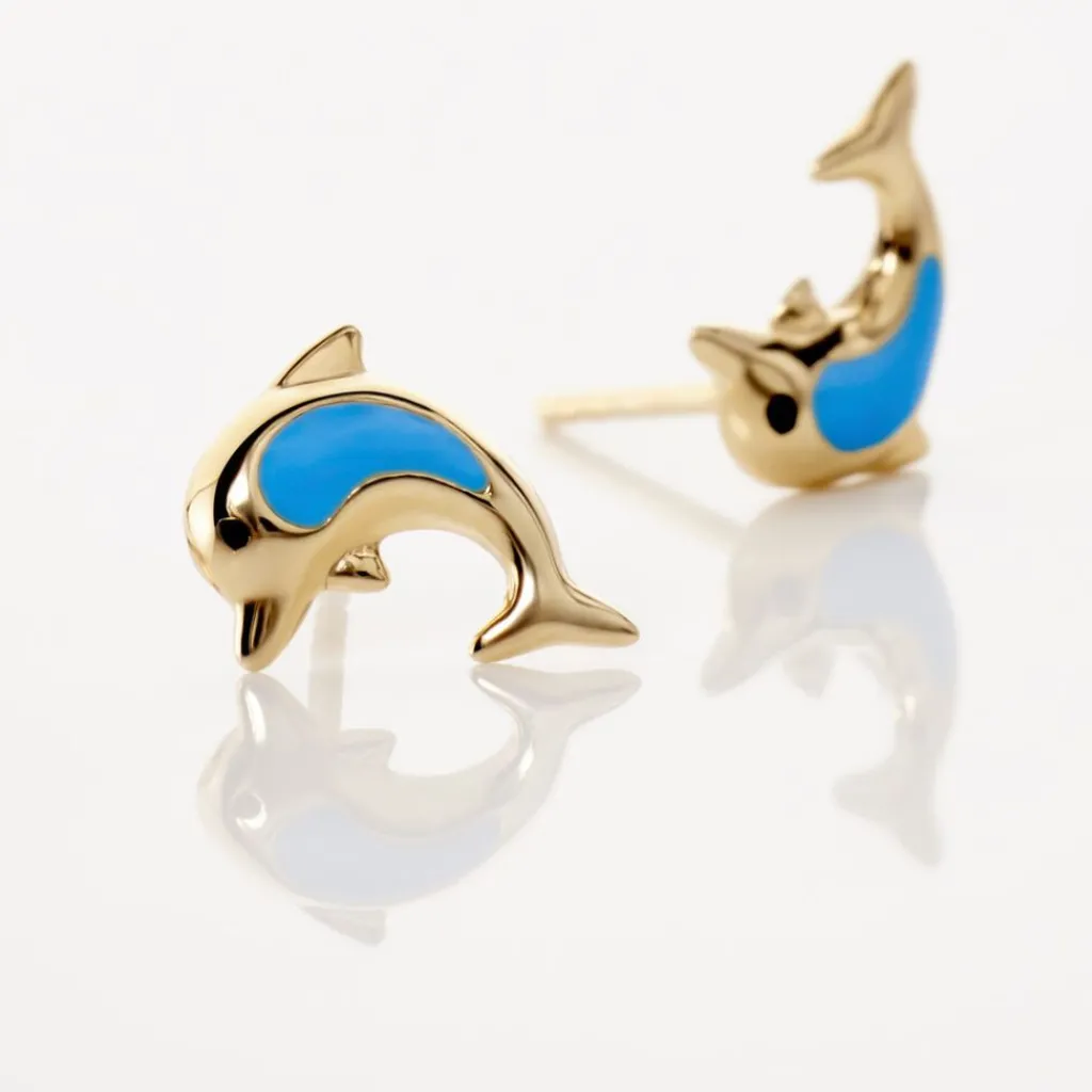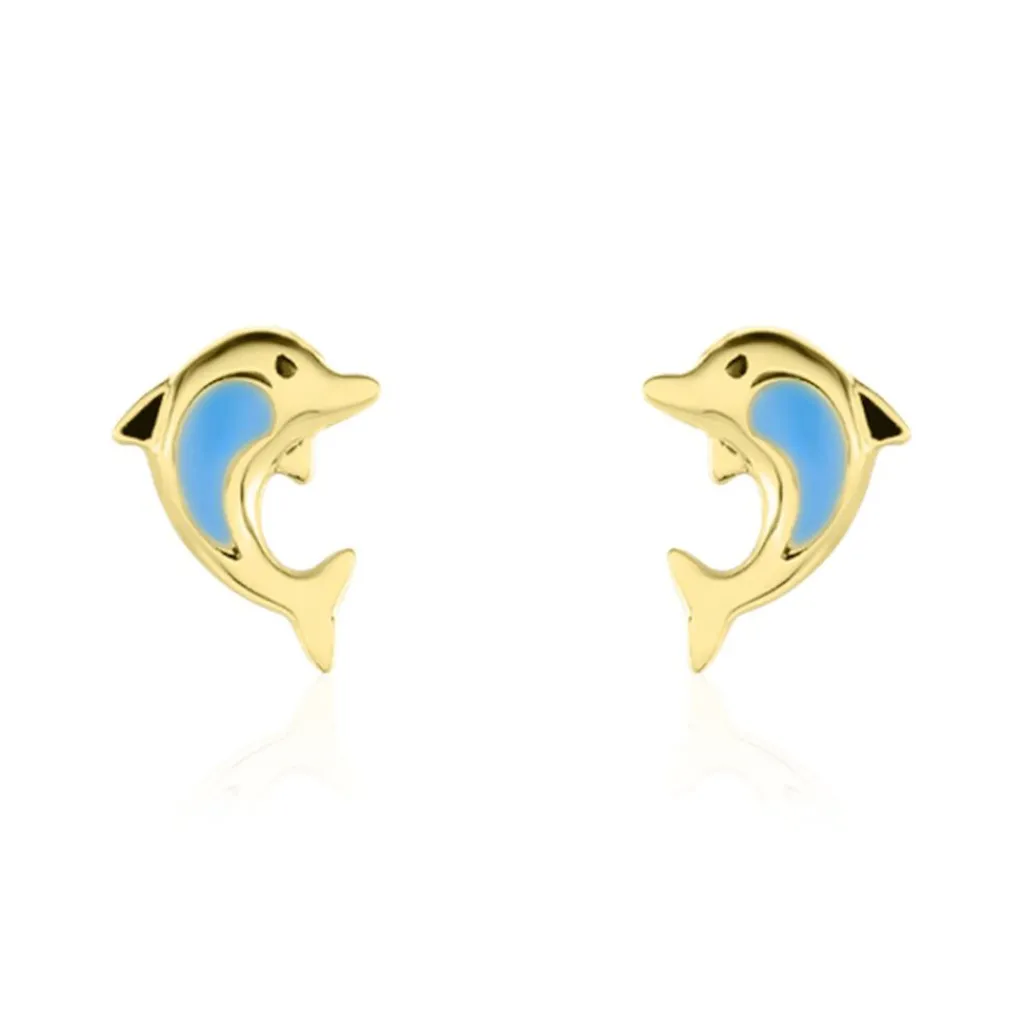 Boucles D’oreilles Or Jaune 375/1000 Puce Dauphin Smalto Bleu
