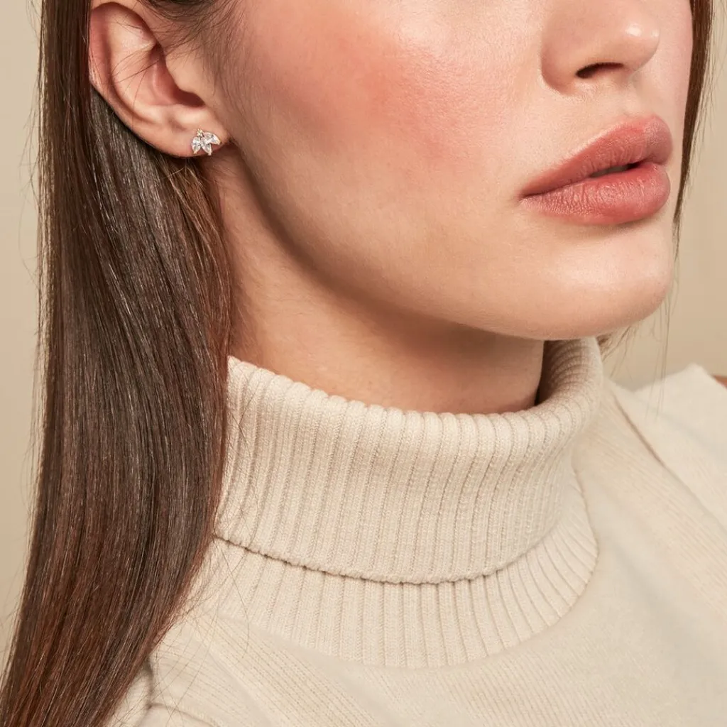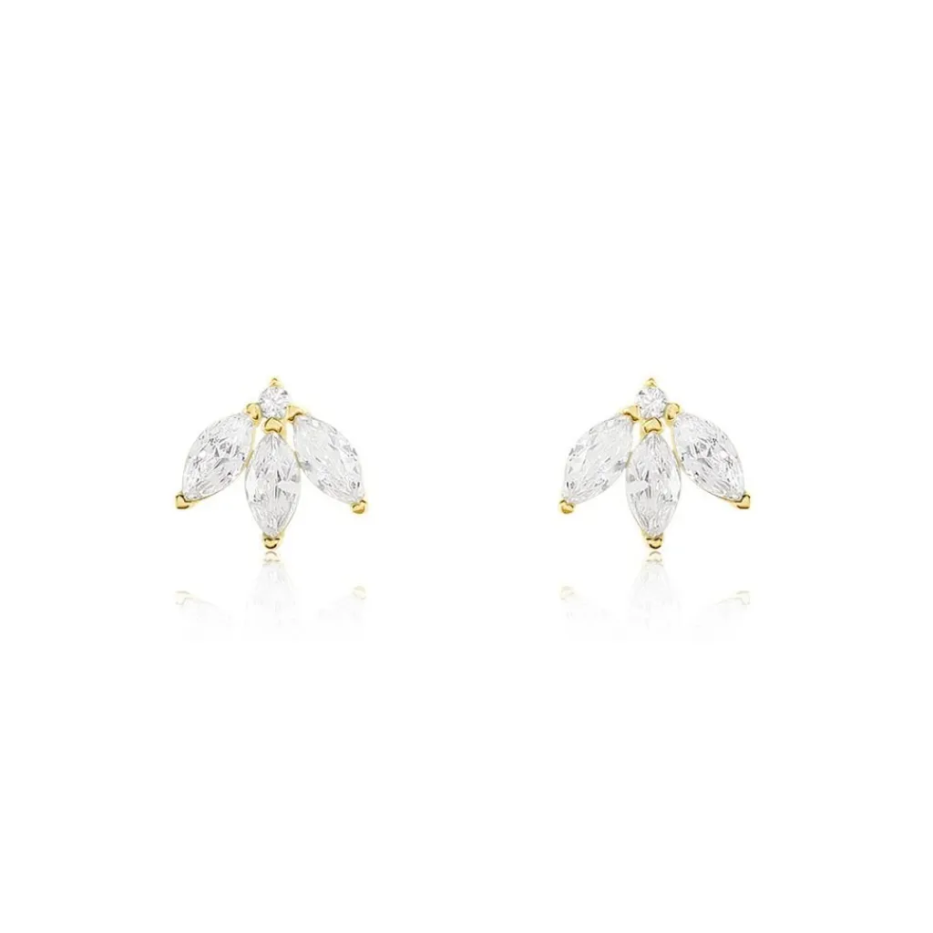 Boucles D’oreilles Puces Or Jaune 375/1000 Fleur Oxydes De Zirconium Navette Et Rond Serti Griffes