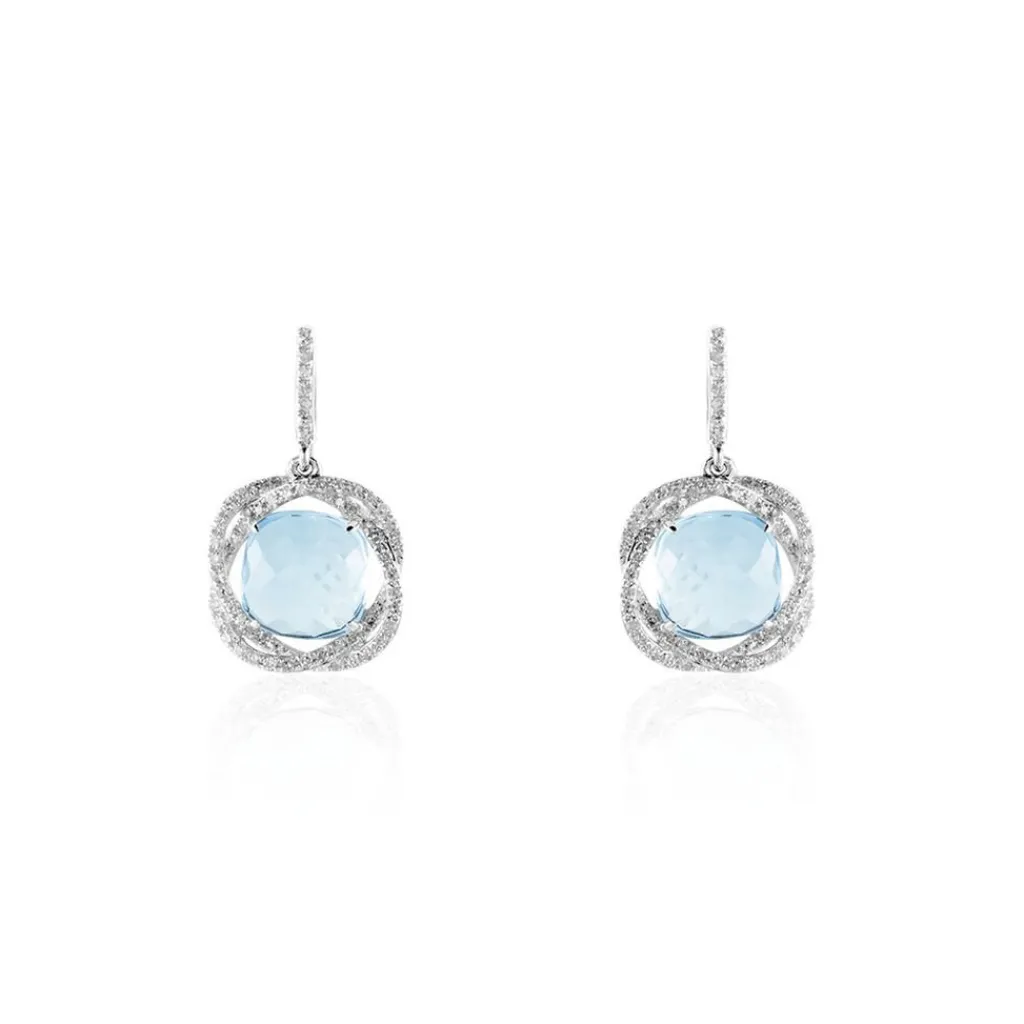 Boucles D’oreilles Or Blanc 375/1000 »lucy » Topazes Bleues Centrales Et Pavage Diamants