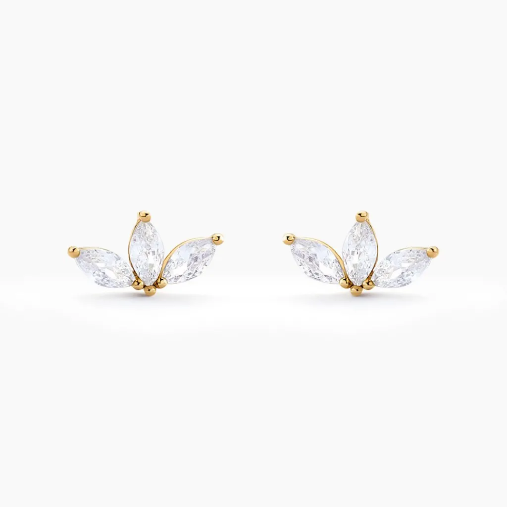 Boucles D’oreilles Puces Or Jaune 375/1000 Fleur Oxyde De Zirconium Navettes Serti Griffes