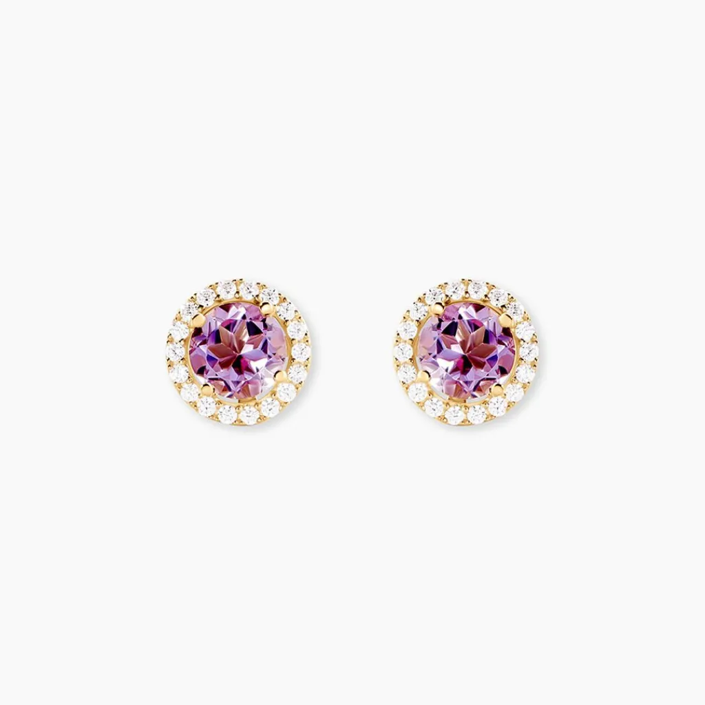 Boucles D’Oreilles Puces Or Jaune 375/1000 Solitaire Amethyste 0,6Cts Sertis 4 Griffes Entourage Oxyde De Zirconium