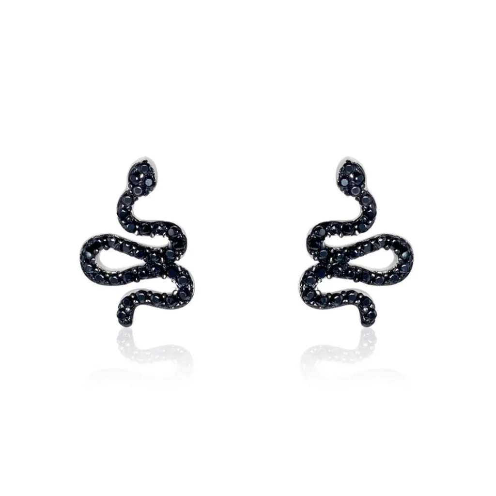 Boucles D’oreilles Puces Argent Blanc 925/1000 Serpents Pavage Oxydes De Zirconium Noirs