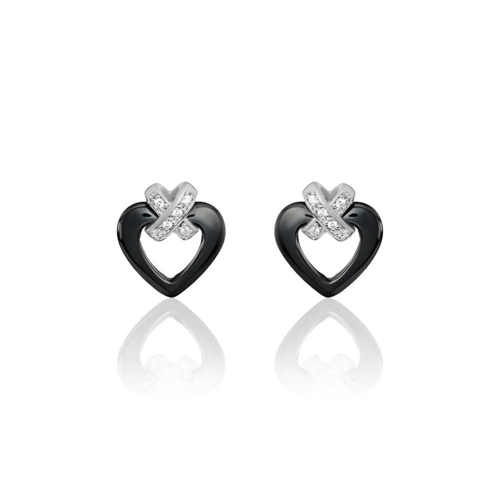Boucles D’oreilles Argent Blanc 925/1000 Ceramiques Noires Forme Coeurs Croix Pavees Oxydes De Zirconium