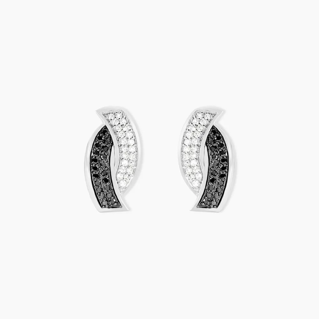 Boucles D’oreilles Or Blanc 375/1000 Puces Formes Croisées Diamants Noirs Et Diamants Blancs