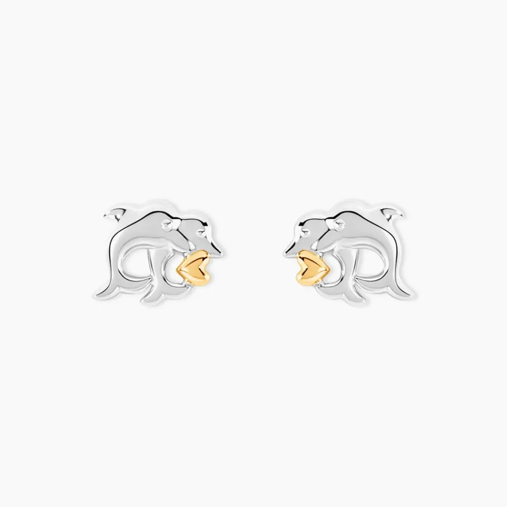 Boucles D’Oreilles Puces Or Jaune 375/1000 Et Argent Blanc 925/1000 Dauphin Et C艙ur
