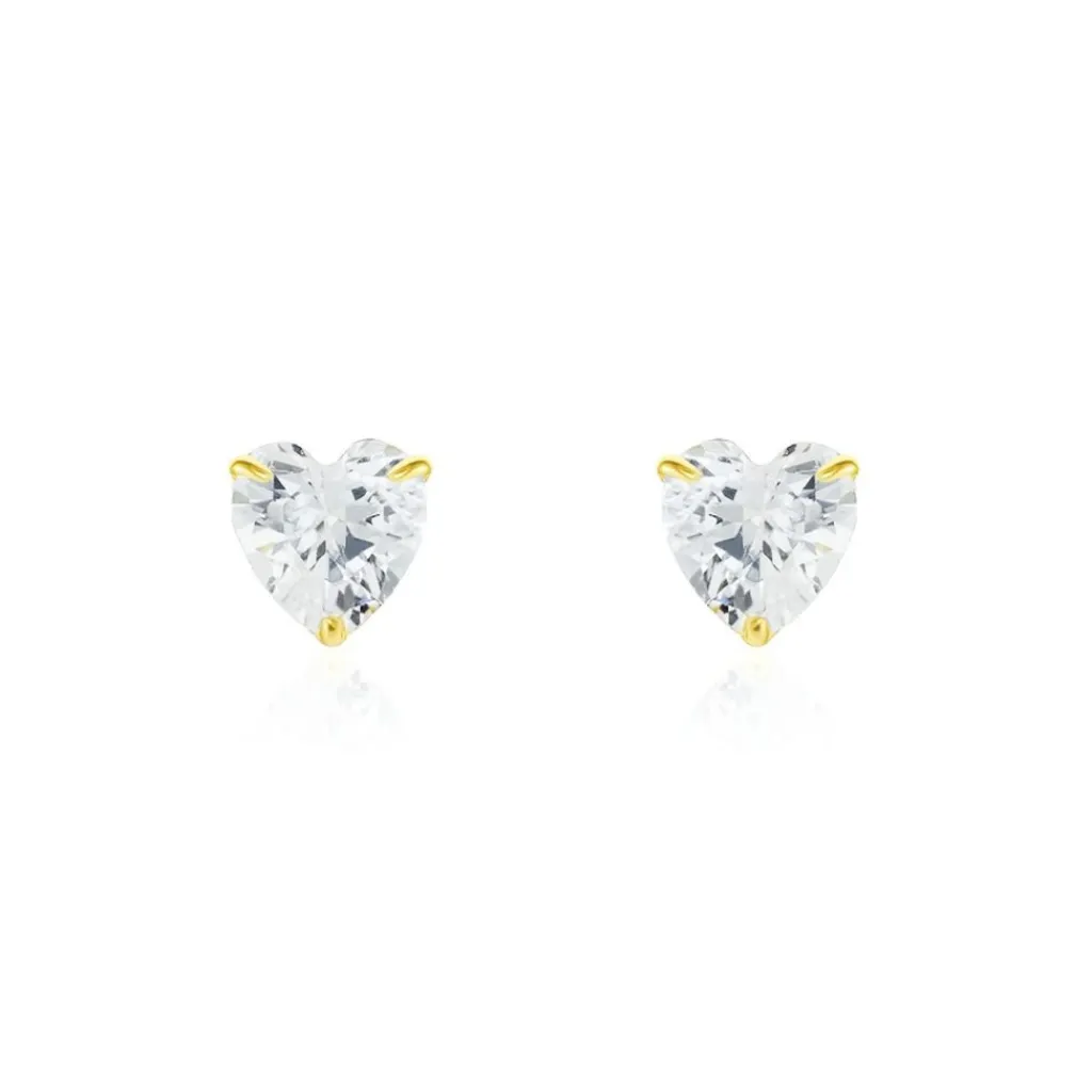 Boucles D’oreilles Puces Or Jaune 375/1000 Coeur Oxyde De Zirconium Serti 4 Griffes 5mm
