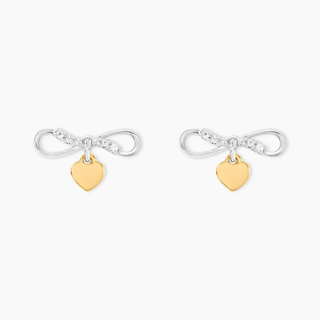 Boucles D’Oreilles Puces Or Jaune 375/1000 Et Argent Blanc 925/1000 Infini Pavage Oxydes De Zirconium Blancs Et C艙ur Pendant