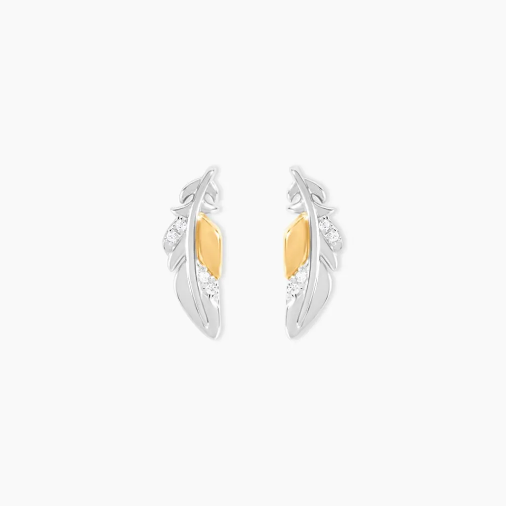 Boucles D’Oreilles Puces Or Jaune 375/1000 Et Argent Blanc 925/1000 Plume Oxydes De Zirconium Blancs