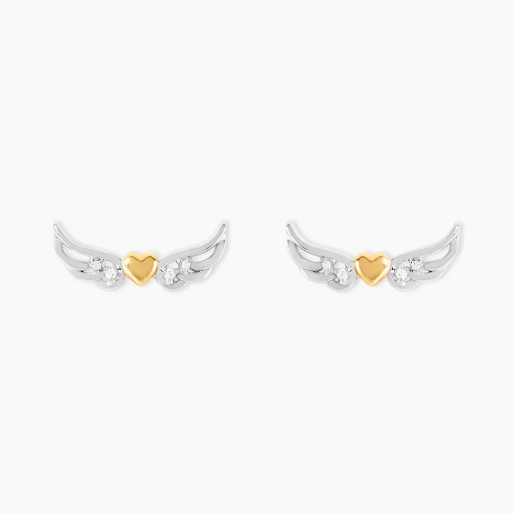 Boucles D’Oreilles Puces Or Jaune 375/1000 Et Argent Blanc 925/1000 Ailes Oxydes De Zirconium Blancs Et C艙ur Central