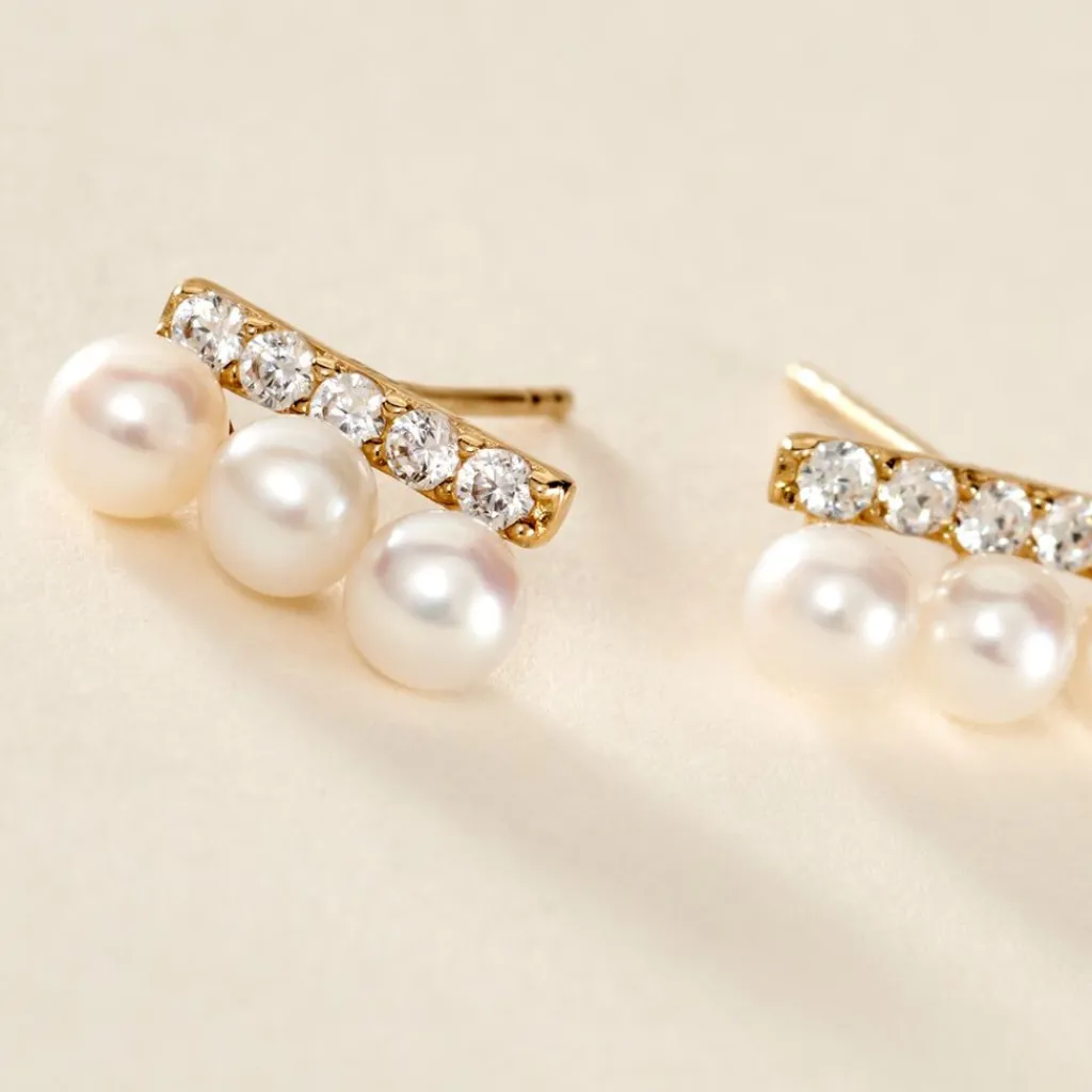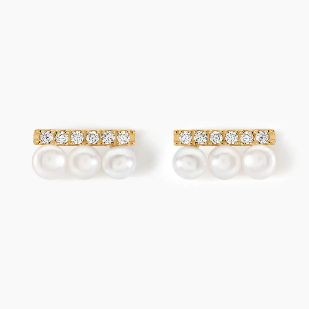 Boucles D’oreilles Puces Or Jaune 375/1000 3 Perles De Culture Blanches Et Barre Oxydes De Zirconium Serti Griffes