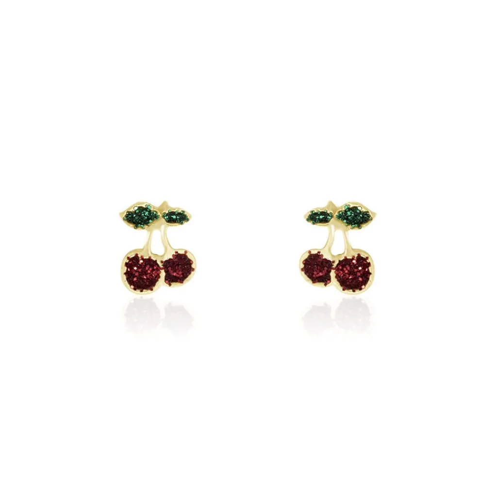 Boucles D’oreilles Puces Or Jaune 375/1000 Cerise Glitter Rouge
