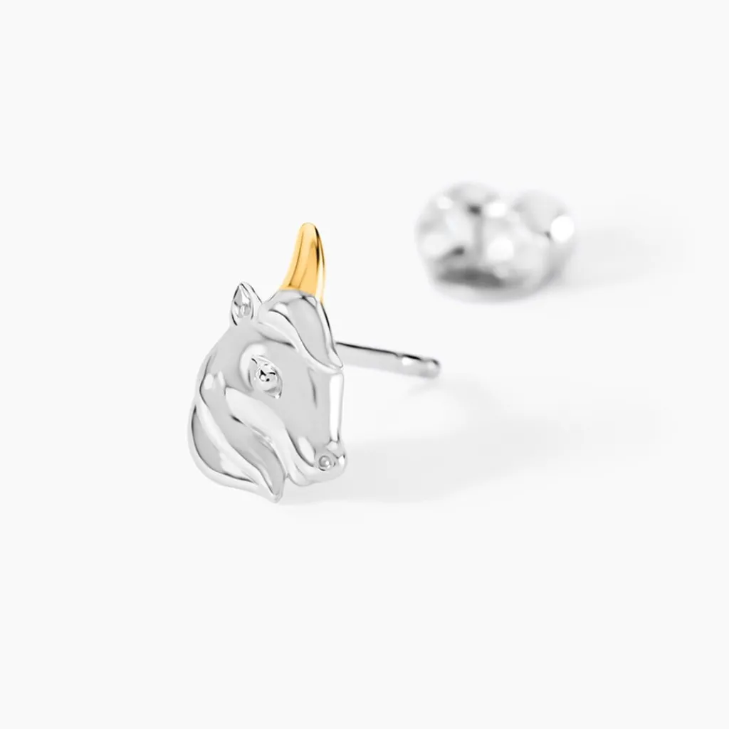 Boucles D’Oreilles Puces Or Jaune 375/1000 Et Argent Blanc 925/1000 Licorne
