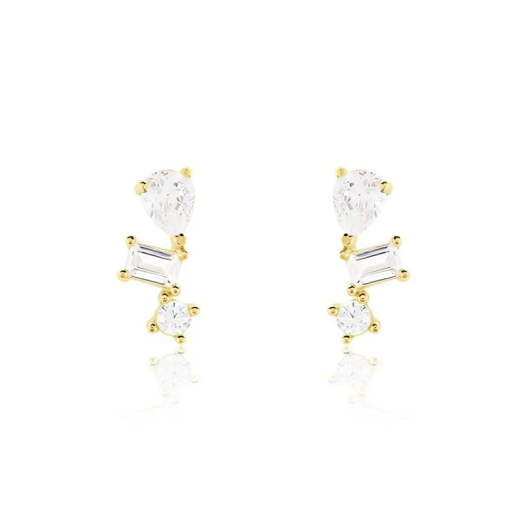 Boucles D’oreilles Grimpantes Or Jaune 375/1000 Triple Oxydes De Zirconium Poire Rectangle Et Ronde Serti Griffes