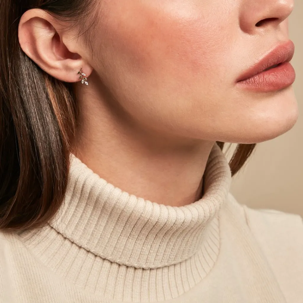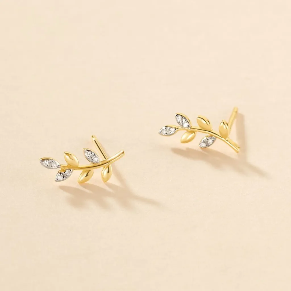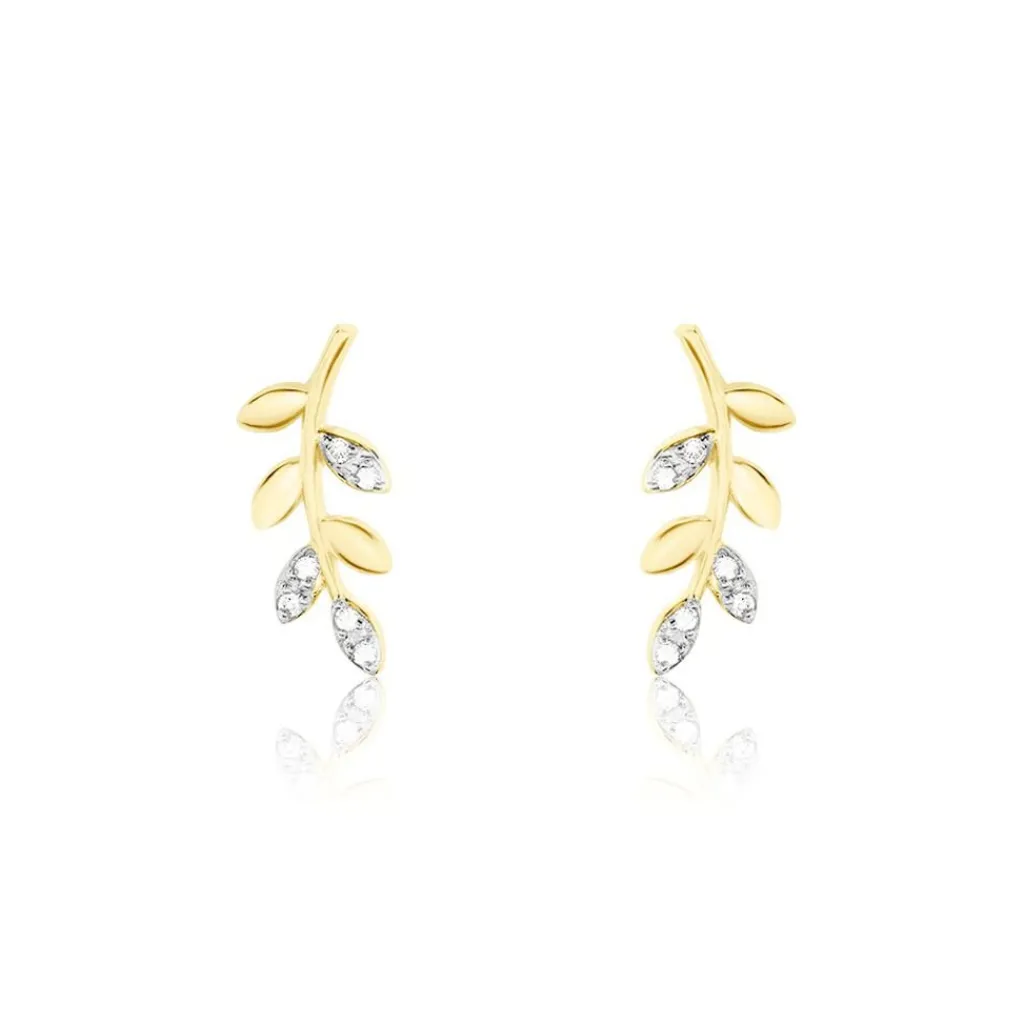 Boucles D’oreilles Puces Or Jaune 375/1000 Feuilles Pavage Diamants Ronds