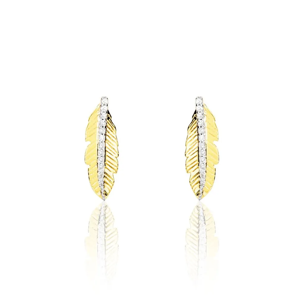 Boucles D’oreilles Or Jaune 375/1000 Puces Formes Plumes + Pavage Diamants