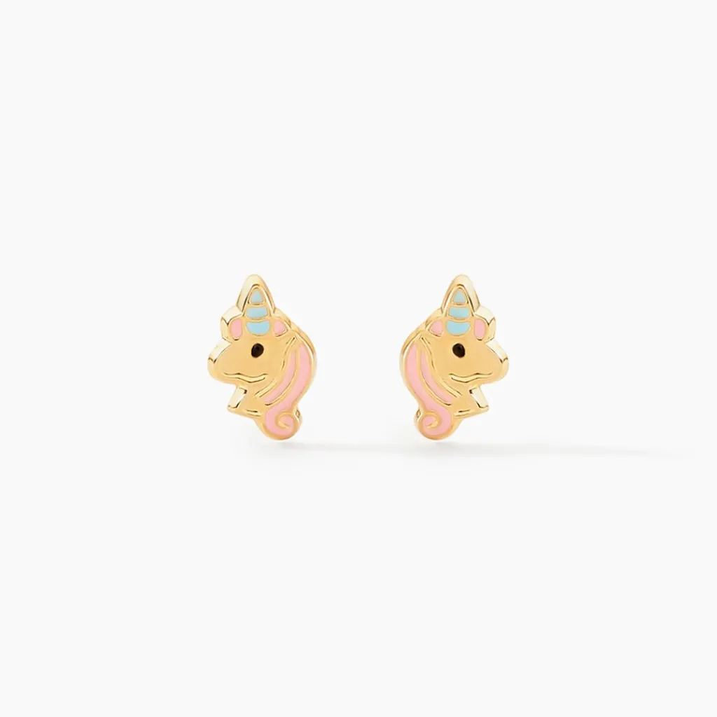 Boucles D’oreilles Puces Or Jaune 750/1000 Licornes Email Multicolore Fermoir A Vis