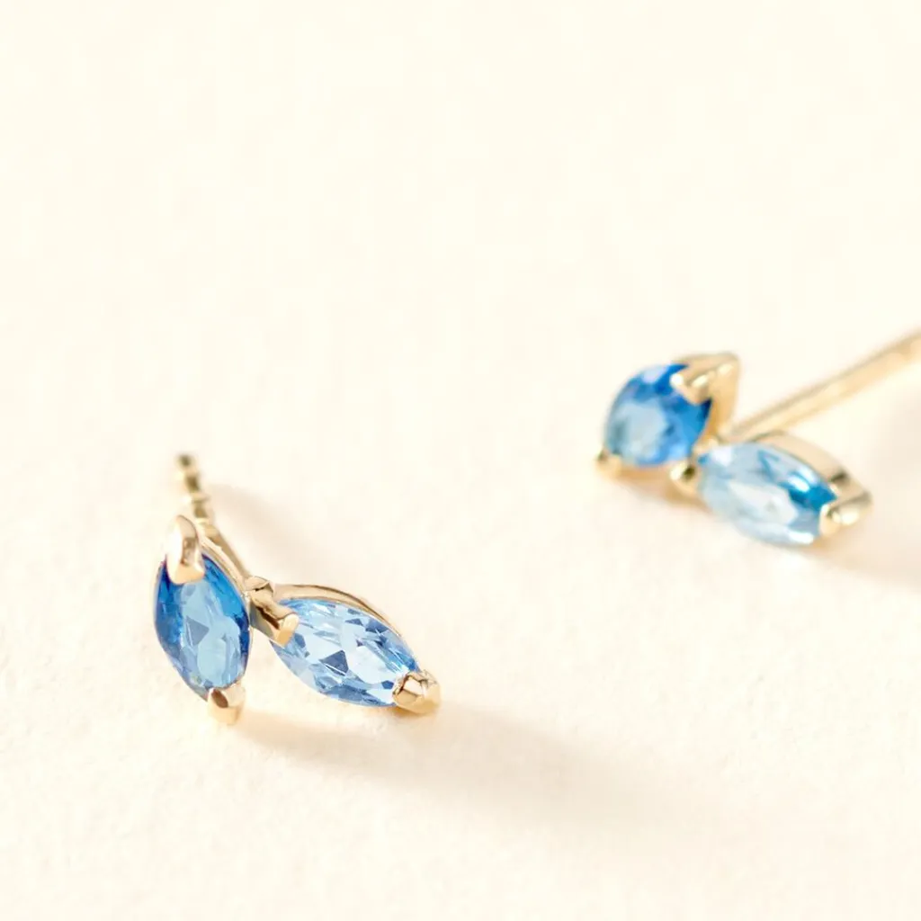 Boucles D’oreilles Puces Or Jaune 375/1000 Oxydes De Zirconium Navettes Bleu Clair Et Bleu Fonce