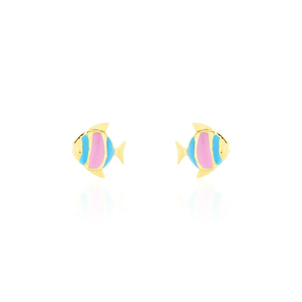 Boucles D’oreilles Or Jaune 375/1000 Poisson Smalto Rose Et Bleu