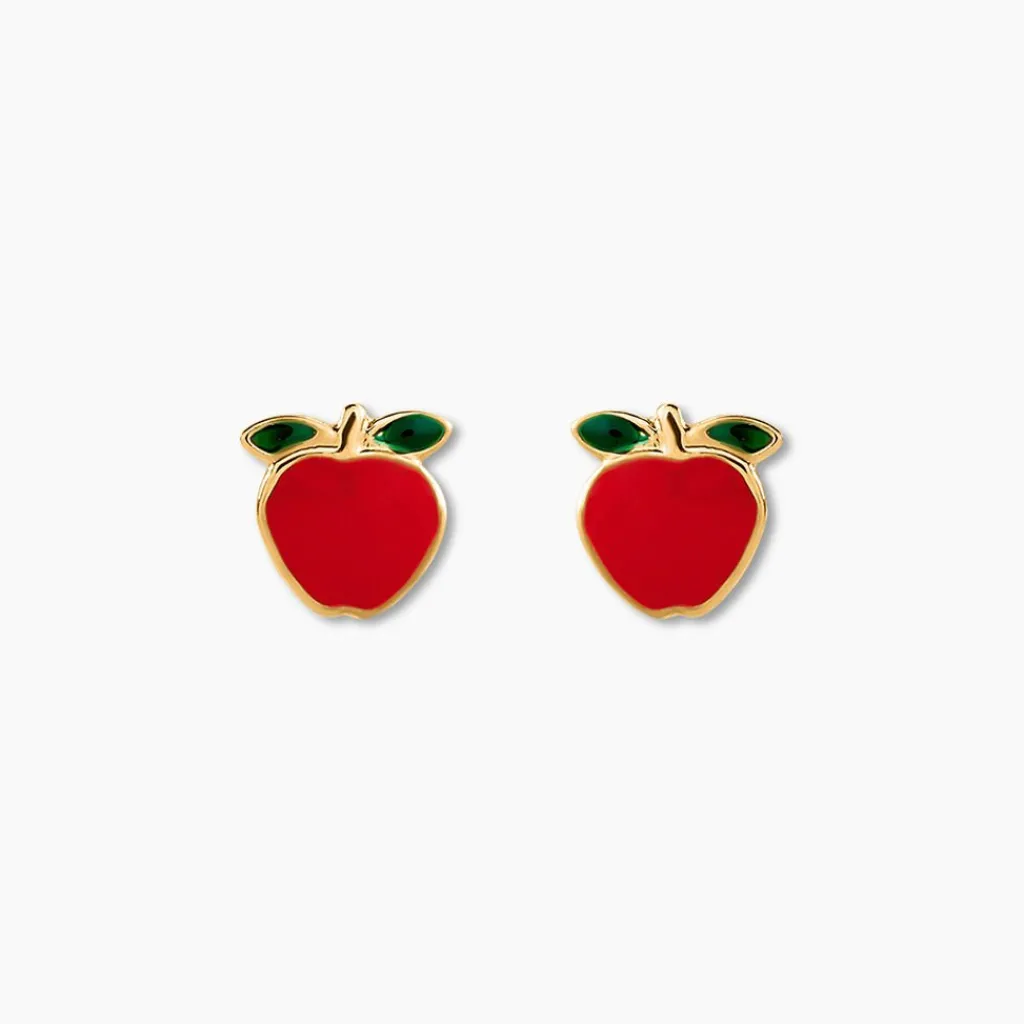 Boucles D’oreilles Puces Or Jaune 750/1000 Pommes Email Rouge Fermoir A Vis