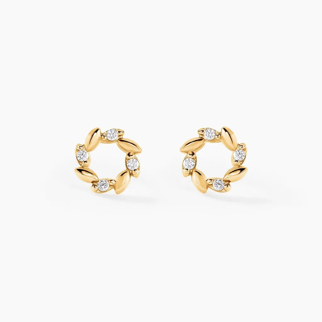 Boucles D’oreilles Puces Or Jaune 375/1000 Cercles Ajoures Grain De Riz Oxydes De Zirconium Sertis Griffes