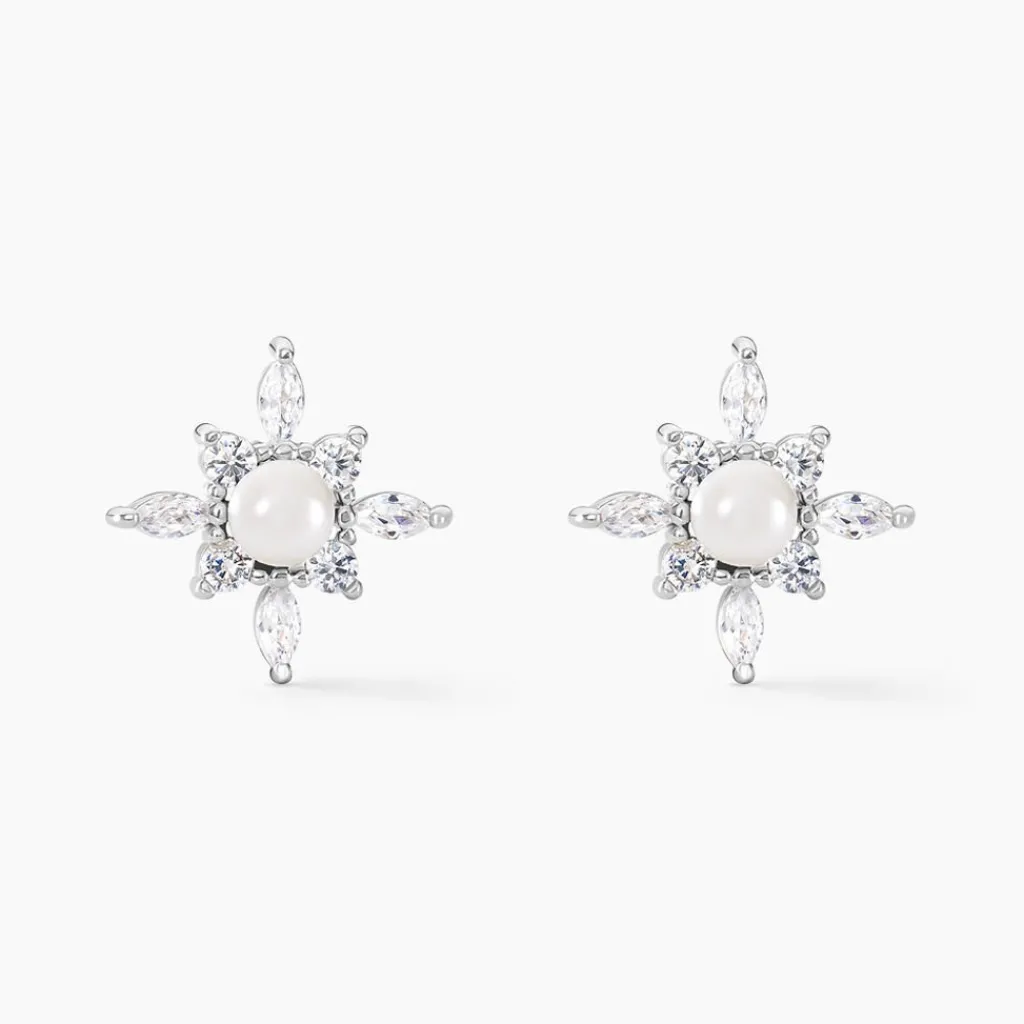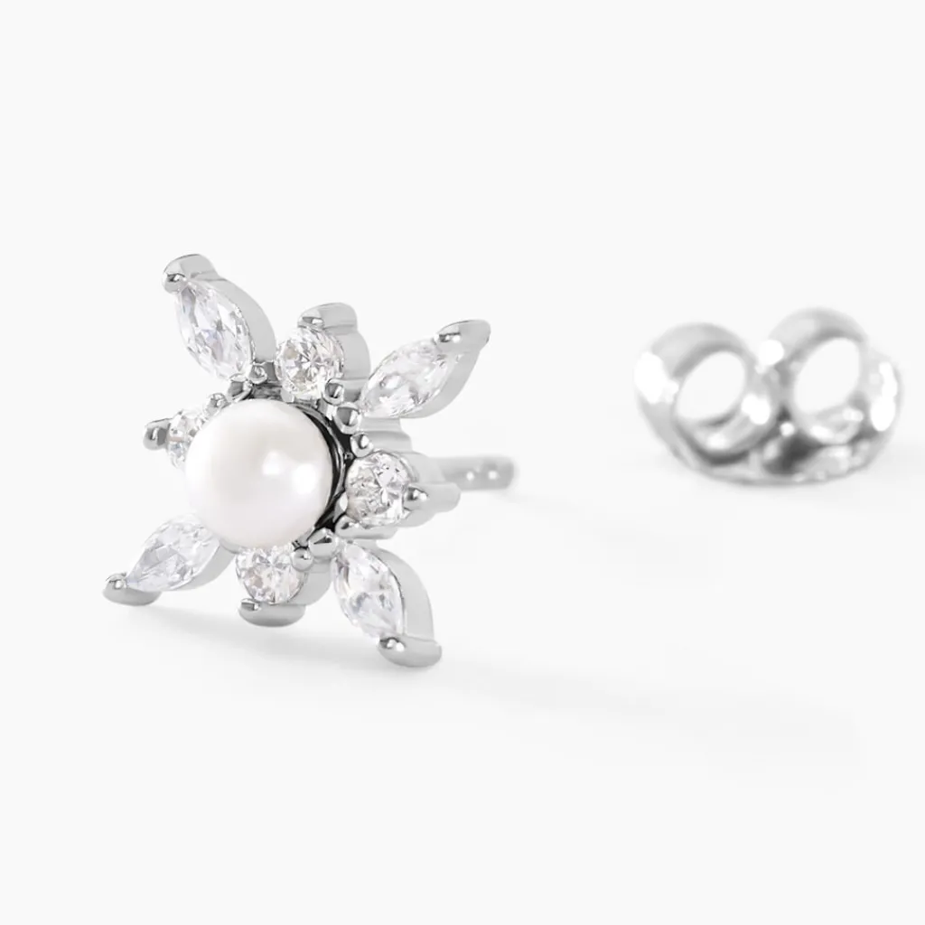 Boucles D’oreilles Puces Argent Blanc 925/1000 Flocons Perles De Culture Et Oxydes De Zirconium
