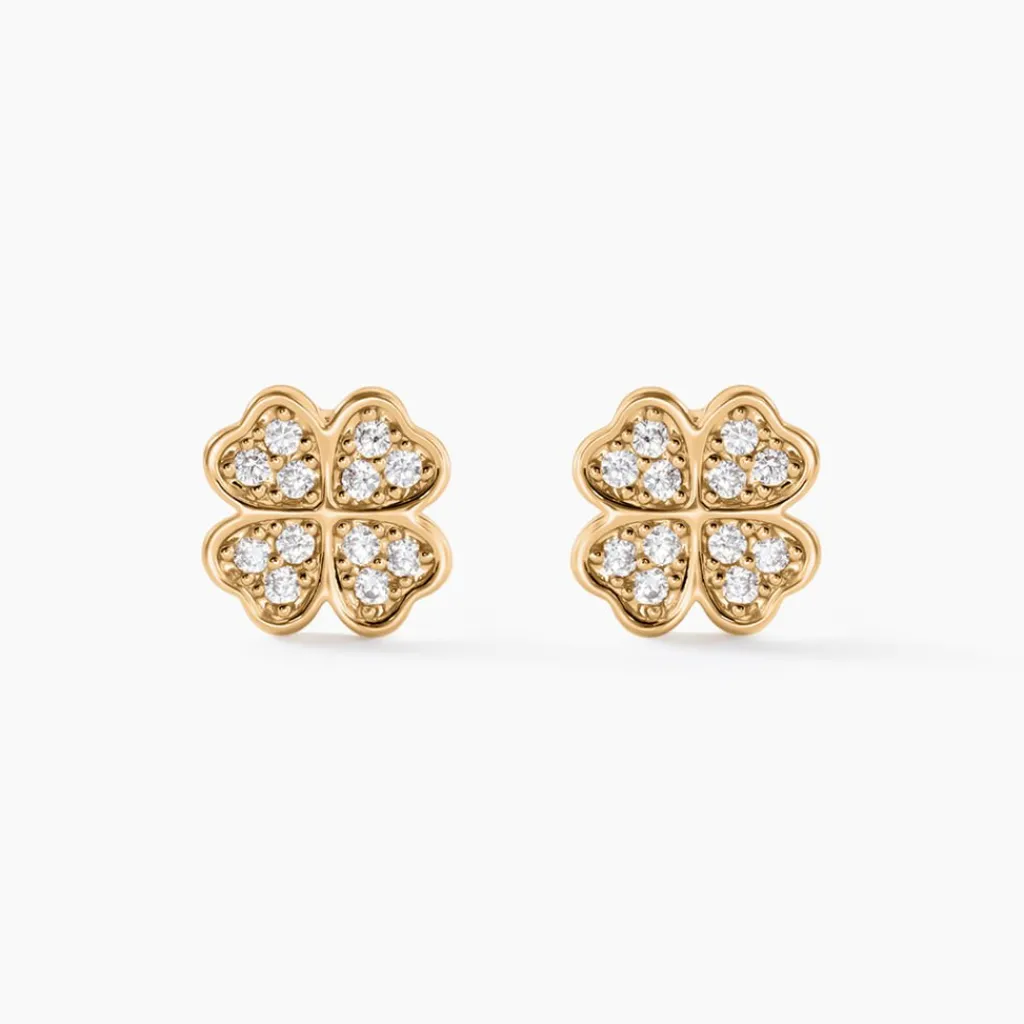 Boucles D’oreilles Puces Plaqué Or Jaune Trèfles Pavage Oxydes De Zirconium