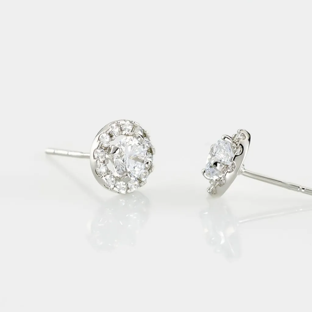 Boucles D’oreilles Or Blanc 375/1000 Puces Entourages Oxydes De Zirconium