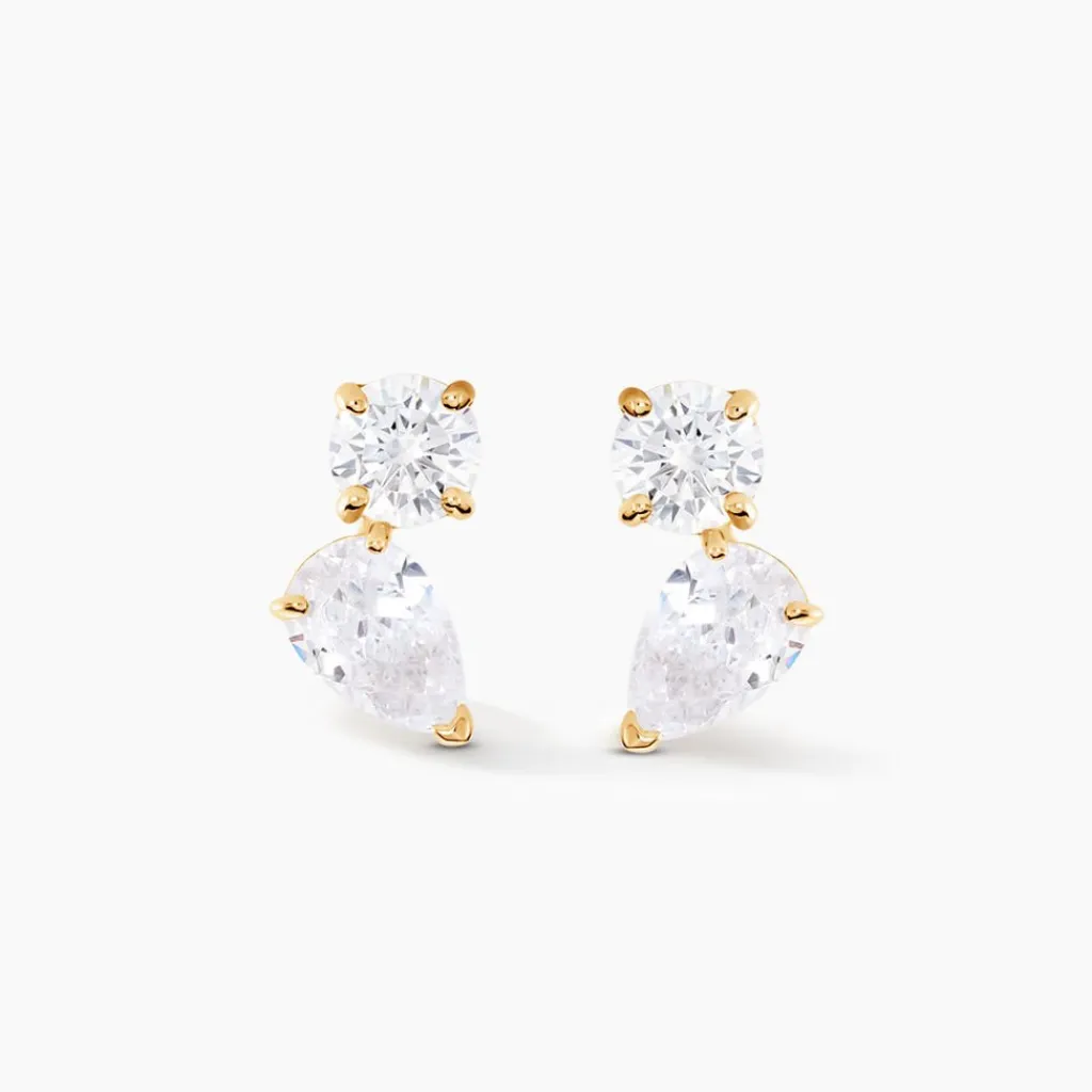 Boucles D’oreilles Puces Or Jaune 375/1000 Goutte Et Rond Oxyde De Zirconium Serti Griffes