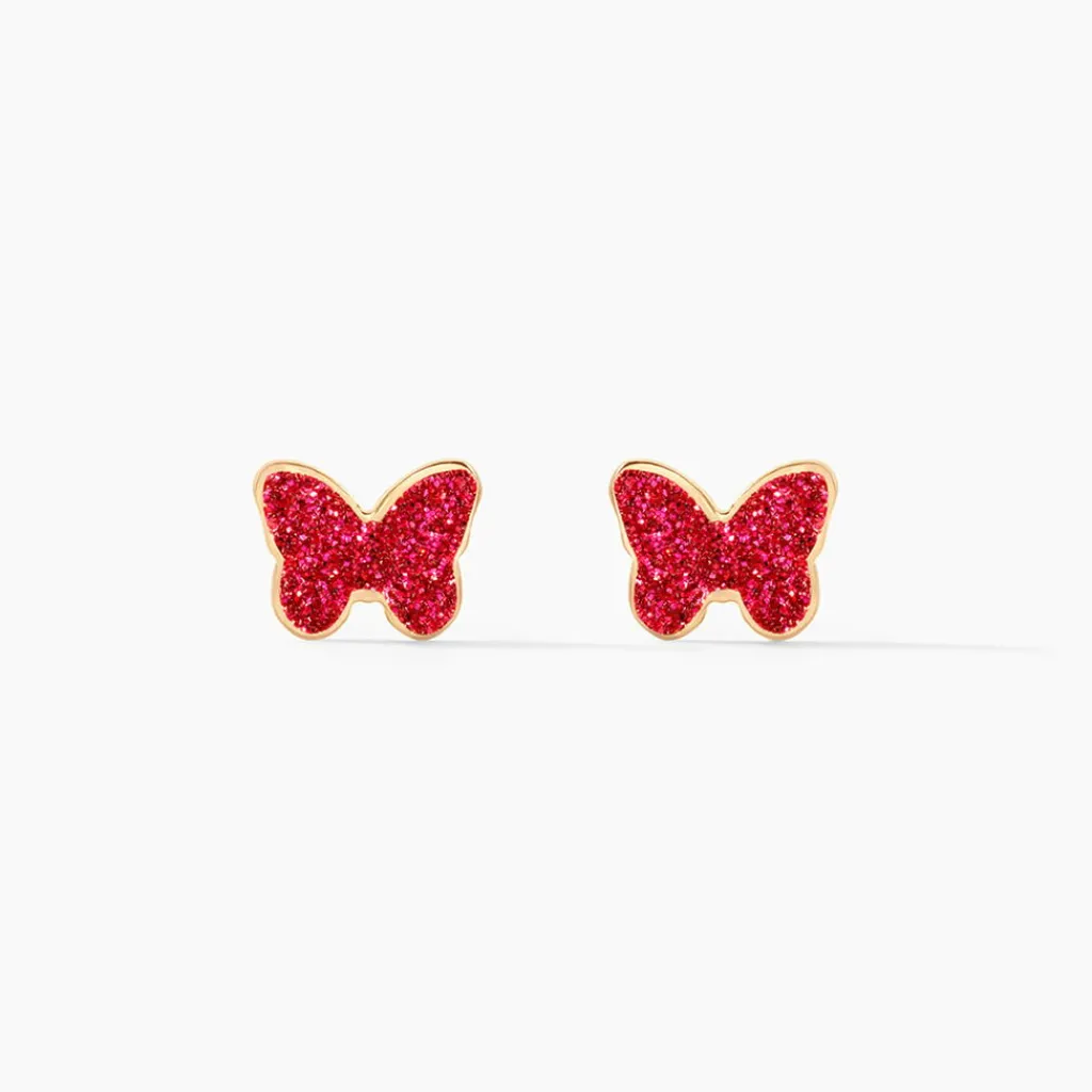 Boucles D’oreilles Or Jaune 375/1000 Puces Papillons Glitter Fushia
